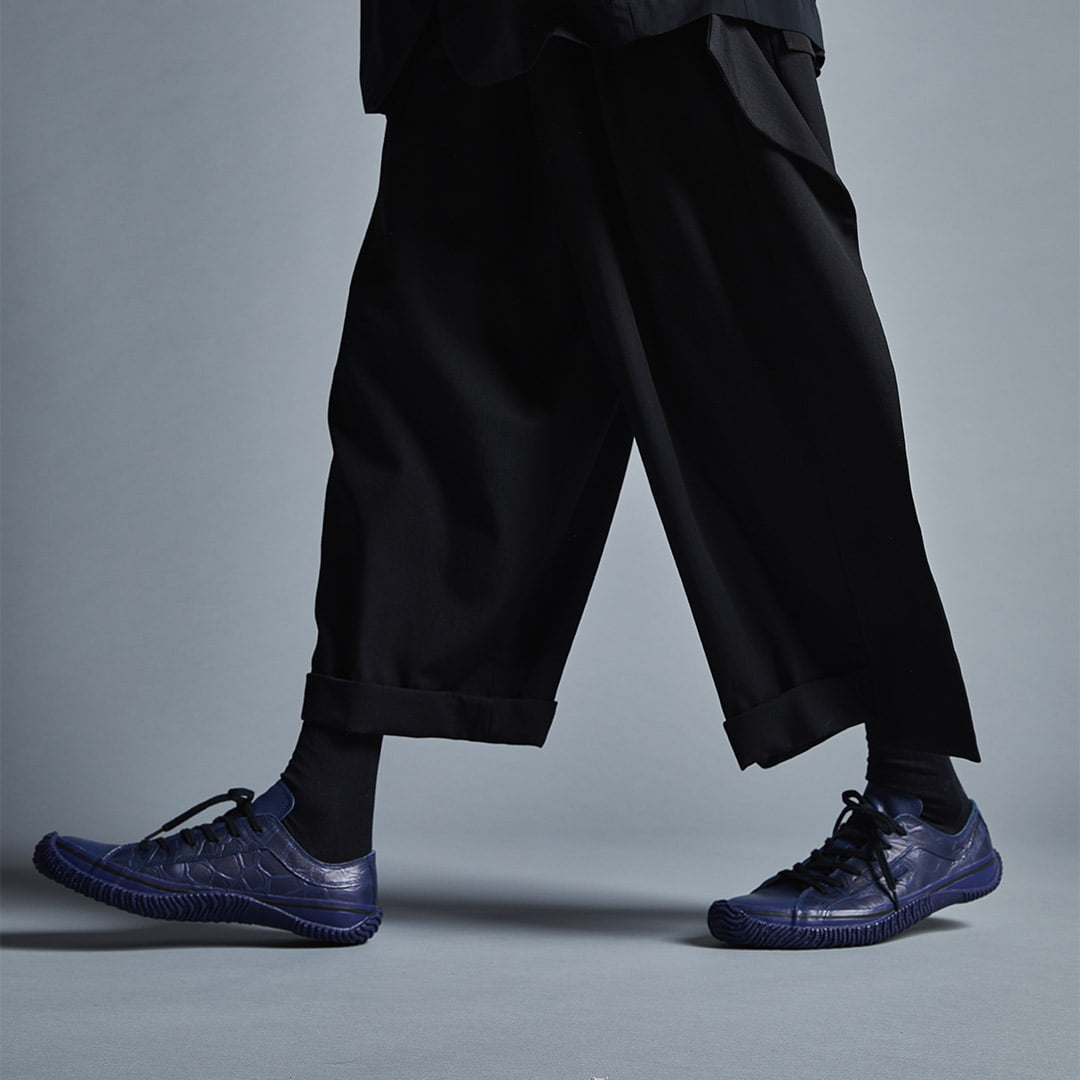型押しレザーにインディゴ染めを施し、陰影の美しさを引き立てたローカットモデル。アッパーは日本古来から「青は藍より出でて藍より青し」と表現され、ジャパンブルーと称される「藍色」で表現し、インディゴ染め特有の味わい深いムラ感が魅力。サイド部分は大柄の型押しで立体感をもたらし、インパクトあるデザインに。