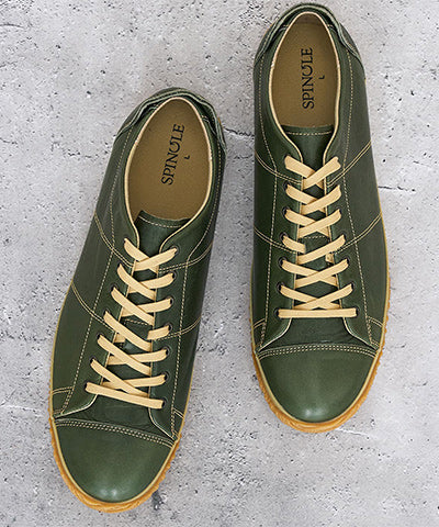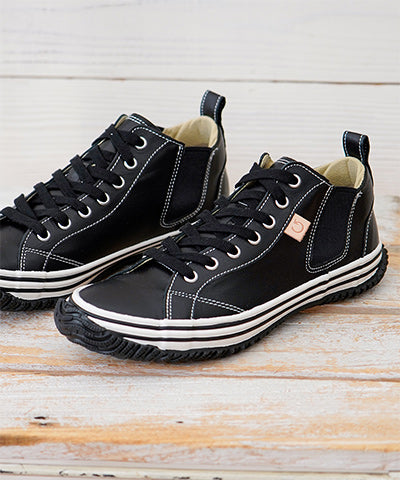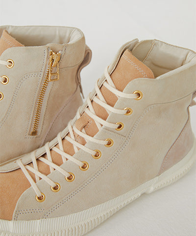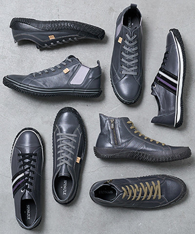 SPINGLEロゴのワッペンが付いたユーズドデニム生地のハイカットスニーカー。アメリカで廃棄予定だったユーズドデニムを回収し、日本国内で洗浄・分解・パッチワークして蘇らせた素材をアッパーに使用。裁断面をあえて切りっぱなしにし、ヴィンテージ感を演出しています。ワッペンはふっくらと立体感があるサガラ刺繍で、ストリートな雰囲気。ソールには当社ソールブランド「RUBEAR」のCNFソールを採用。植物由来の繊維素材セルロースナノファイバーをアウトソールのゴムに配合し、従来よりも耐摩耗性が約40%向上しています。