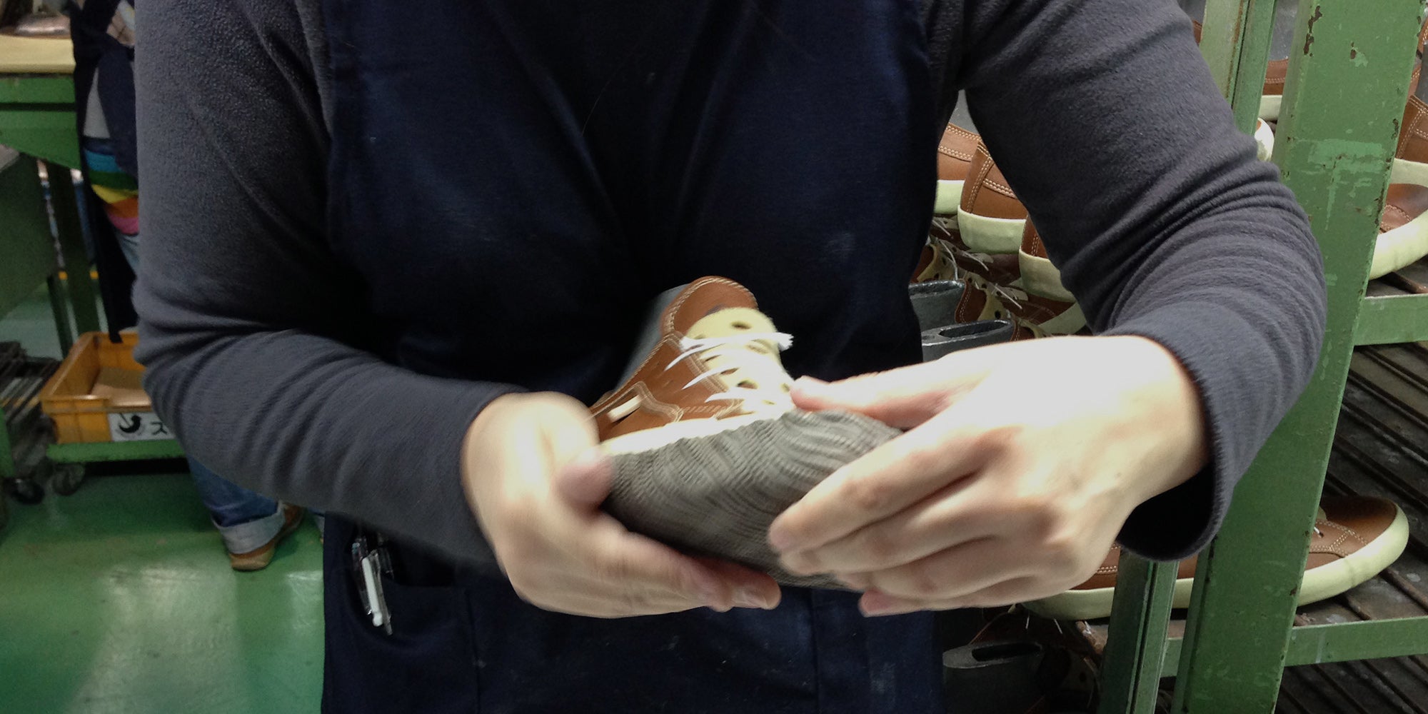 やっているのは吊り込みの横着けという作業で、機械で前側を釣り込んだ状態のものを、内側と外側両側をラスト(足型)に合わせてつけるという作業です。もちろん靴の見た目に影響するんですが、ひっぱり加減で履き口の高さが変わって、足入れが悪くなったりするので、注意して行っています。