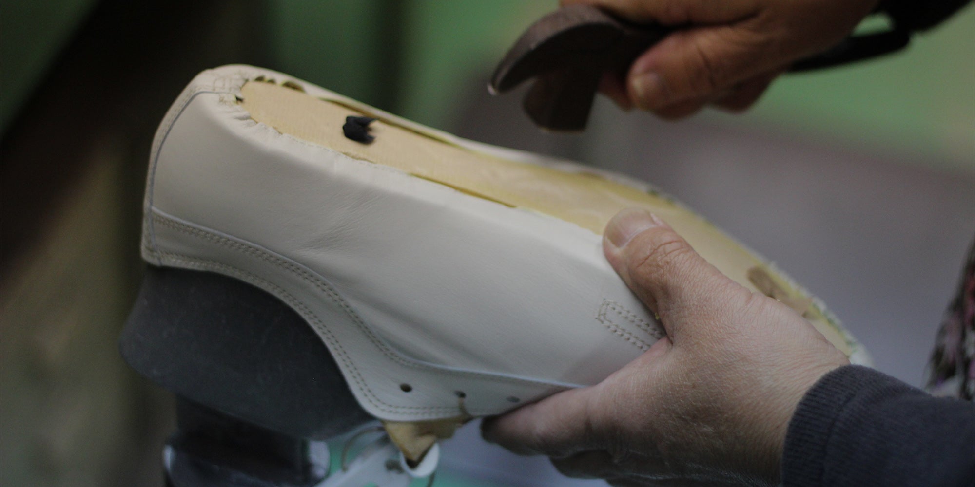 木型に沿わしてシワがないようにアッパーを釣り込む作業をしています。難しいところは飾りのある素材のときに左右対称にするのが大変です。また、材料が変わると部位によっては革の伸び方が微妙に違ったりするので、手作業で左右しっかり合わせてバランスをとってやっています。幅が左右違ったり高さがあってないと見た目がおかしくみえてしまうので、アナログですがミリ単位で誤差がないように同じ幅で沿わせるように努力しています。