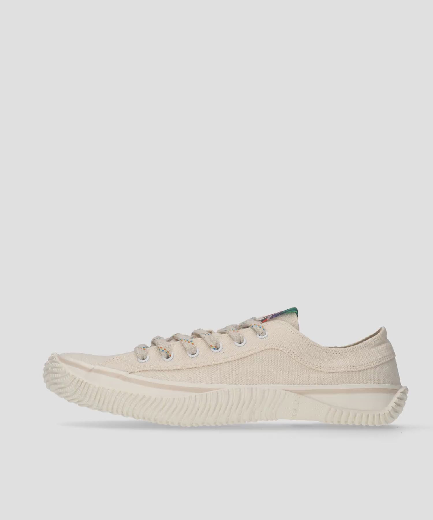 広島に寄贈され祈りの役目を終えた折り鶴から再生した糸を使い、オリジナルの帆布に仕立てアッパーに採用した特別な一足。折り鶴の紙から再生された糸「折り鶴レーヨン糸」は当初とても繊細な素材でした。開発当初はスニーカーの素材として採用することが極めて困難でしたが、綿糸と混紡することでスニーカーとして耐え得る強度を持ちあわせたキャンバス生地を目指し、1年以上の歳月をかけて生地メーカー様と協働開発、試行錯誤を繰り返し誕生に至りました。丈夫かつしなやか、綿帆布とは一味違った滑らかな肌触りのタッチで心地よいフィット感を生み出します。