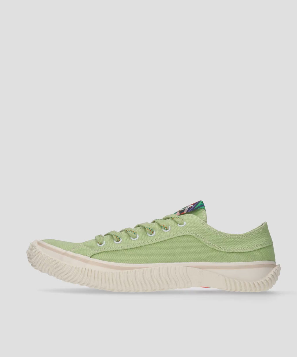 広島に寄贈され祈りの役目を終えた折り鶴から再生した糸を使い、オリジナルの帆布に仕立てアッパーに採用した特別な一足。折り鶴の紙から再生された糸「折り鶴レーヨン糸」は当初とても繊細な素材でした。開発当初はスニーカーの素材として採用することが極めて困難でしたが、綿糸と混紡することでスニーカーとして耐え得る強度を持ちあわせたキャンバス生地を目指し、1年以上の歳月をかけて生地メーカー様と協働開発、試行錯誤を繰り返し誕生に至りました。丈夫かつしなやか、綿帆布とは一味違った滑らかな肌触りのタッチで心地よいフィット感を生み出します。
