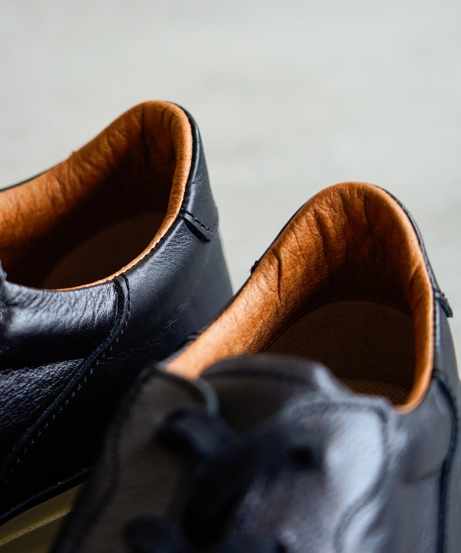 アッパーにはカンガルーレザーとカウレザーをコンビ使いし、内羽根と外羽根を融合したクラシカルなデザイン。ヒールパッチが後ろ姿のワンポイントになっています。ソールには当社ソールブランド「RUBEAR」のNRソールを採用し、天然ラバーの柔らかさとしなやかさはそのままに弾力性と耐摩耗性を向上させました。