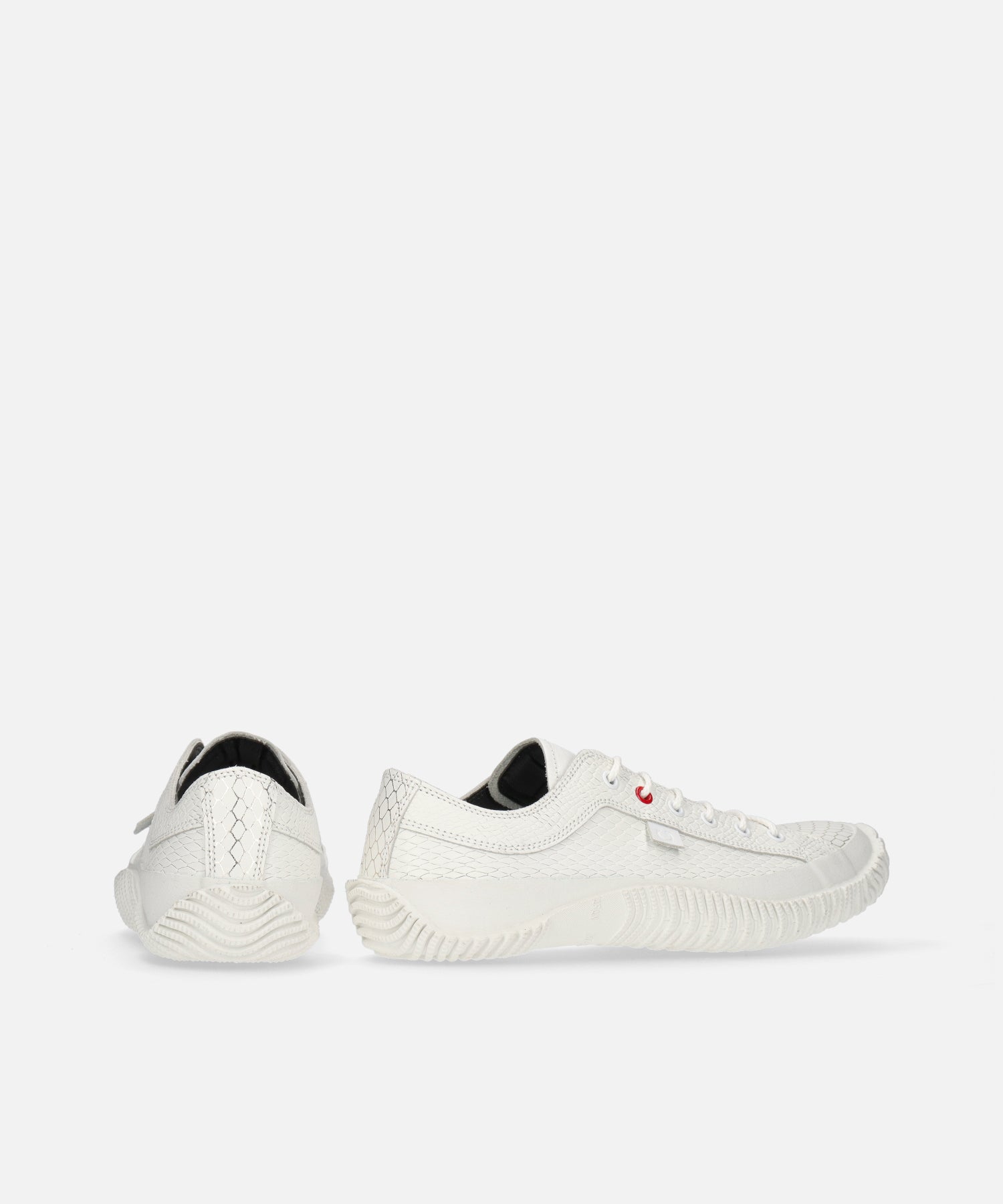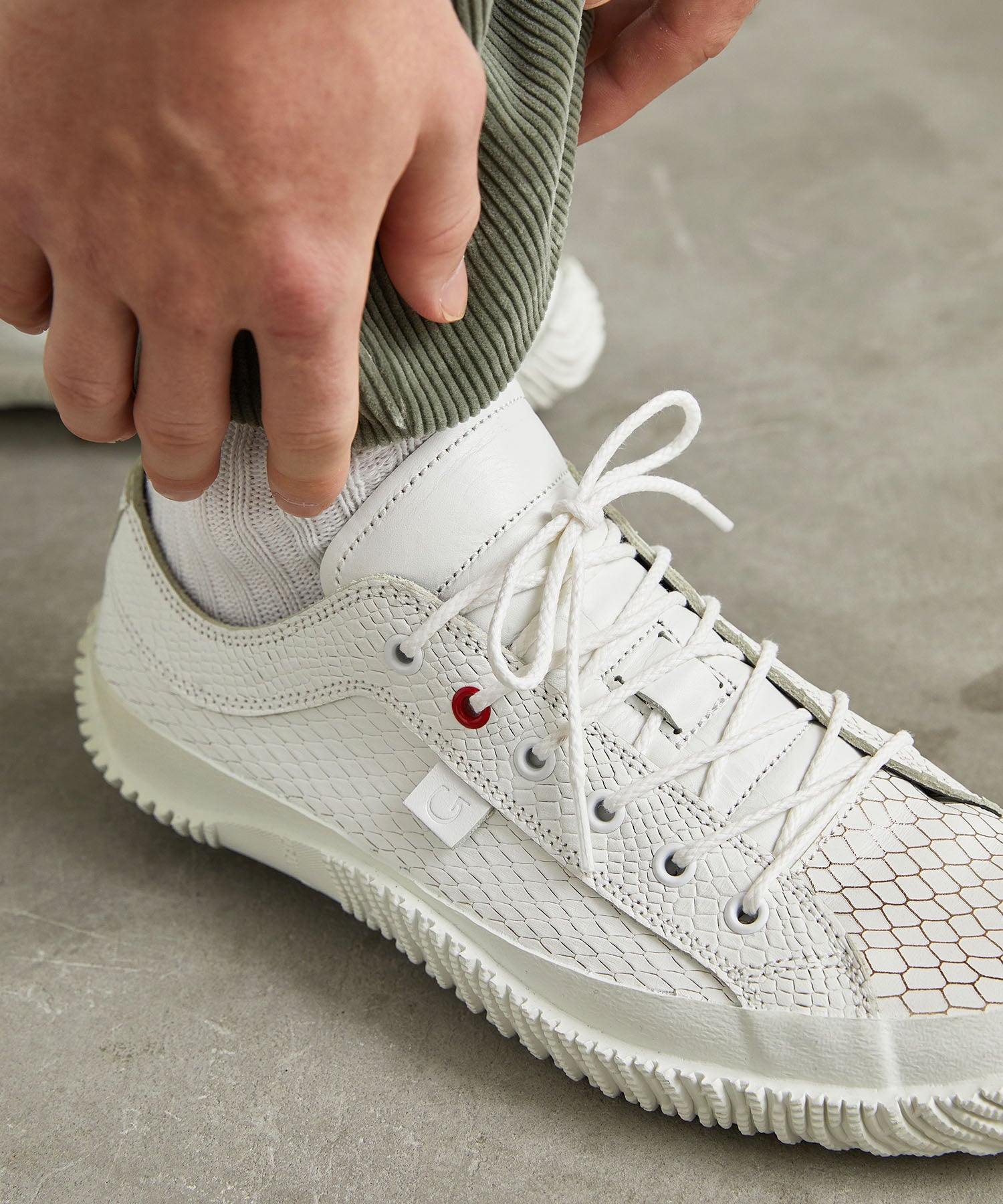 2025年の干支である蛇(巳)をイメージしたニューイヤーモデル。アッパーにはホワイトスネークをモチーフにした蛇柄の型押しレザーを使用。赤い目をハトメで、蛇腹をシュータンで立体的に表現しました。トゥ部分の蛇柄プリントとインソールのブランドロゴはゴールドで仕上げ、細部までこだわった高級感のあるデザインです。