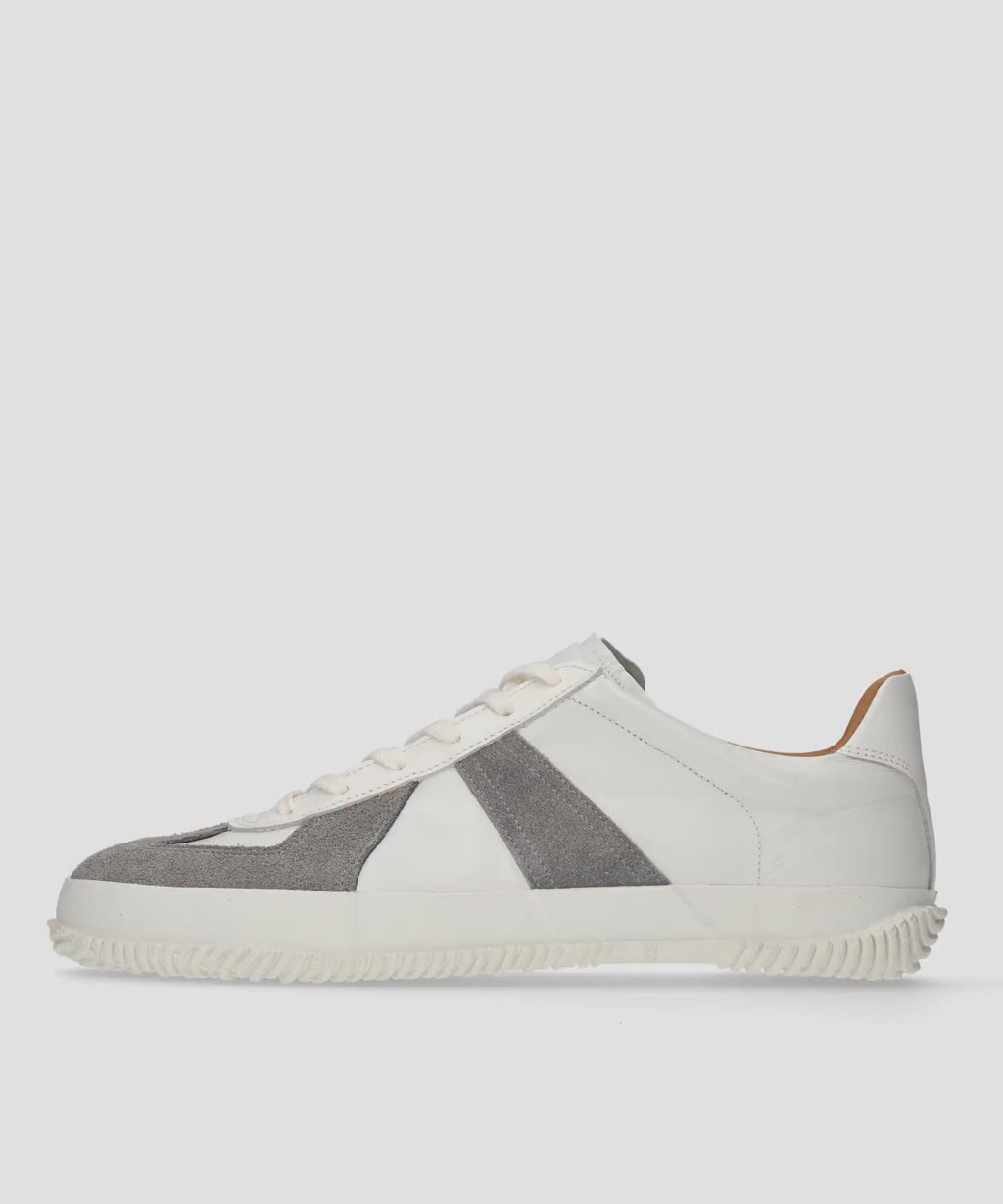 往年のミリタリースニーカー「ジャーマントレーナー」をモチーフにしたローカットモデル。ジャーマントレーナーとは、1970~90年代にドイツ軍で軍用トレーニングシューズとして採用されていたスニーカーの復刻版のこと。現在はローテクスニーカーの定番として有名ブランドや各セレクトショップでも取り扱われるクラシックスニーカーです。柔らかなカンガルーレザーと牛スエードのコンビネーションはシンプルで洗練された印象で、時代を超えて愛される普遍的なデザインが魅力。オーセンティックな雰囲気はそのままに、ミニマルな巻き上げソールでスピングルらしさも注入した一足。