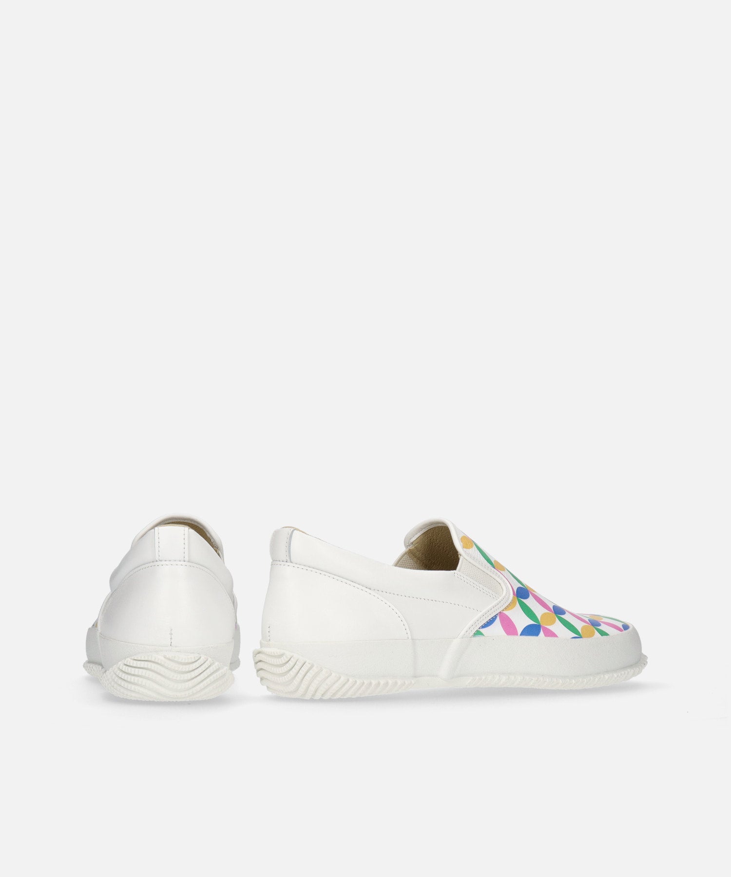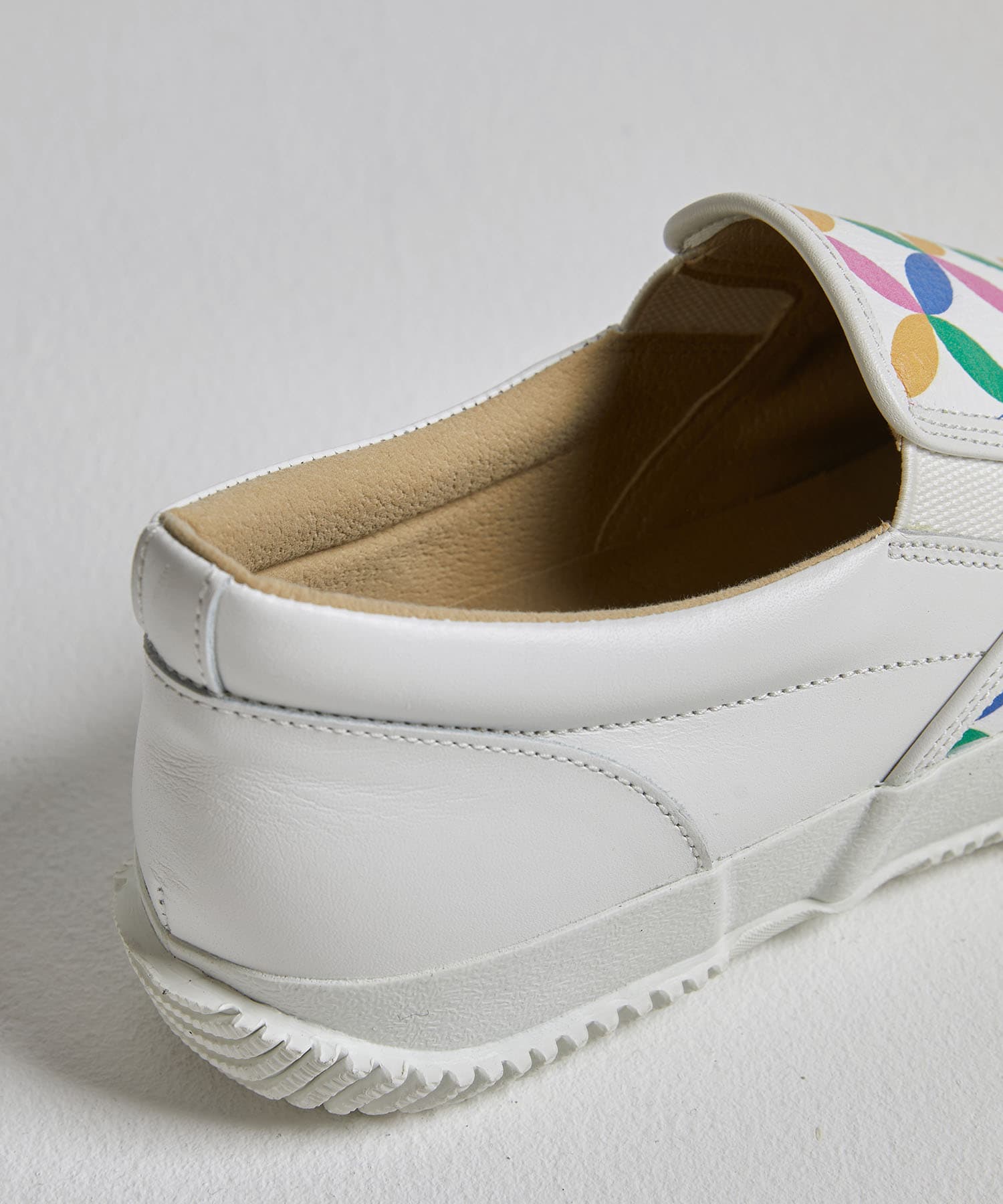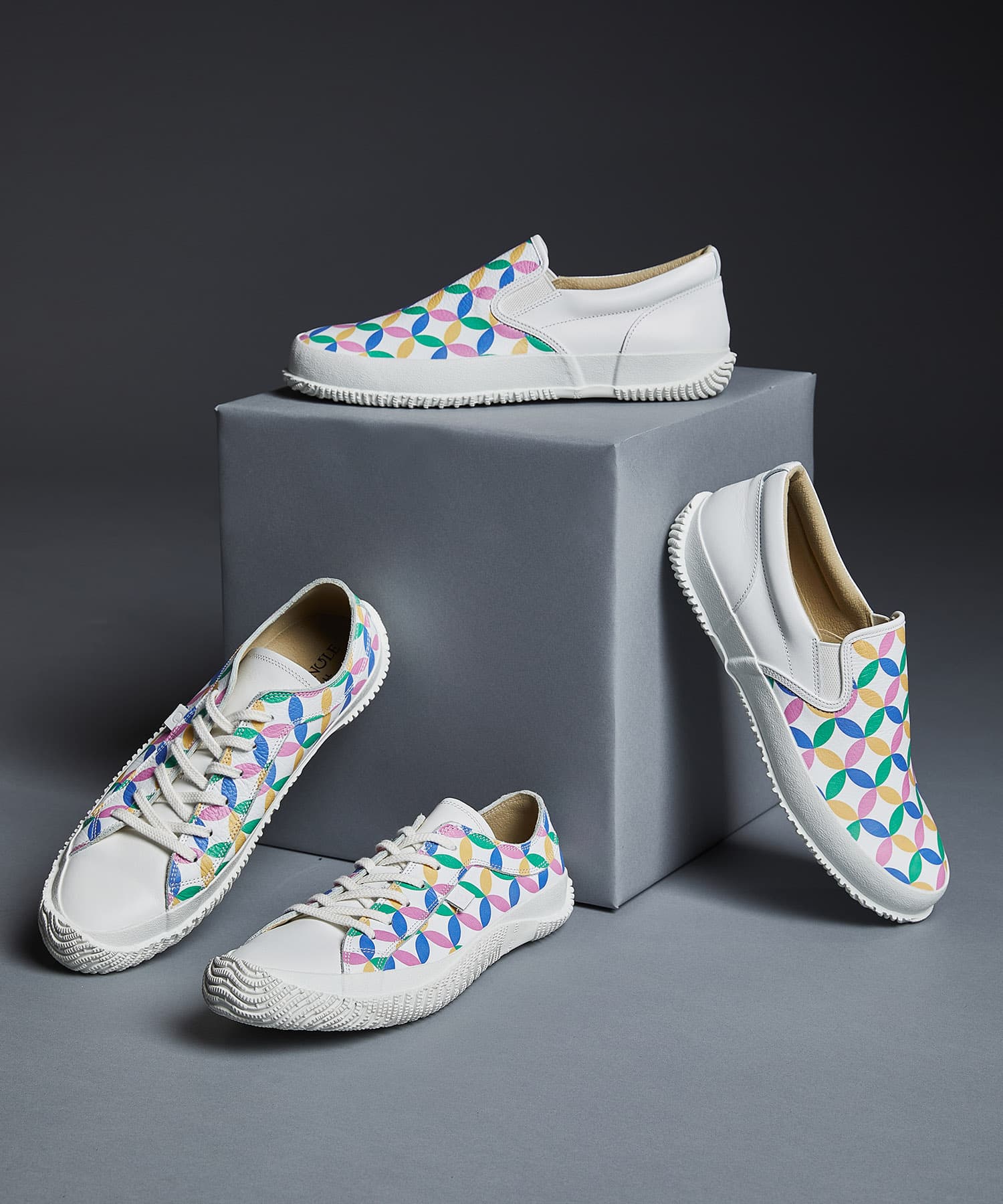 オリジナル七宝柄のプリントレザーを使用したスリッポン。円形が連鎖し繋がる七宝柄には、「円満」「調和」「ご縁」などの意味があり、大変縁起の良い柄とされています。2025年シーズンテーマ「Circle」のもと、日本の美を提唱する「Japan Beauty」を表現した一足。伝統と現代が融合したラグジュアリーな雰囲気、カラフルに彩られた七宝柄がキャッチーでピースフルな足元を演出します。