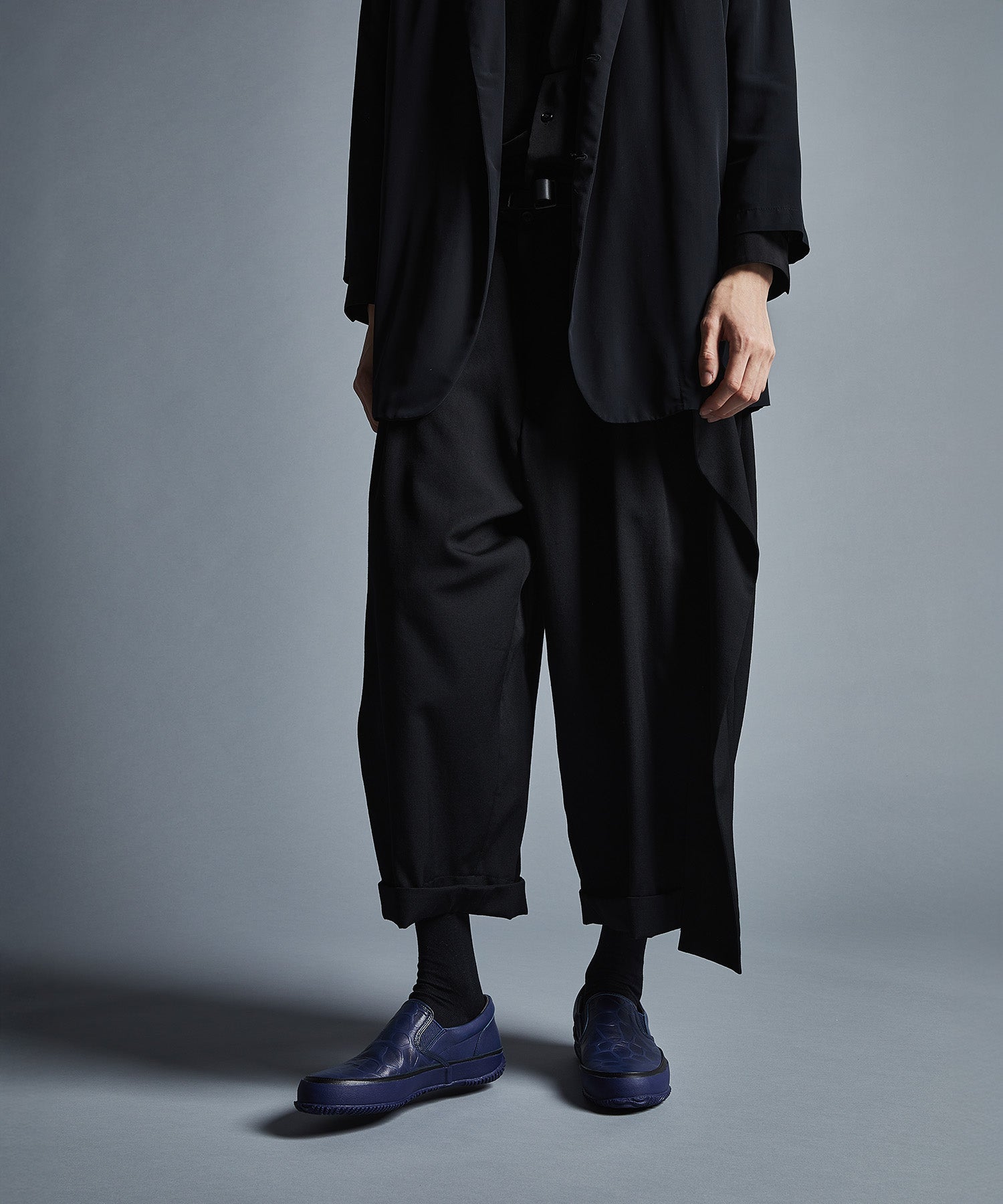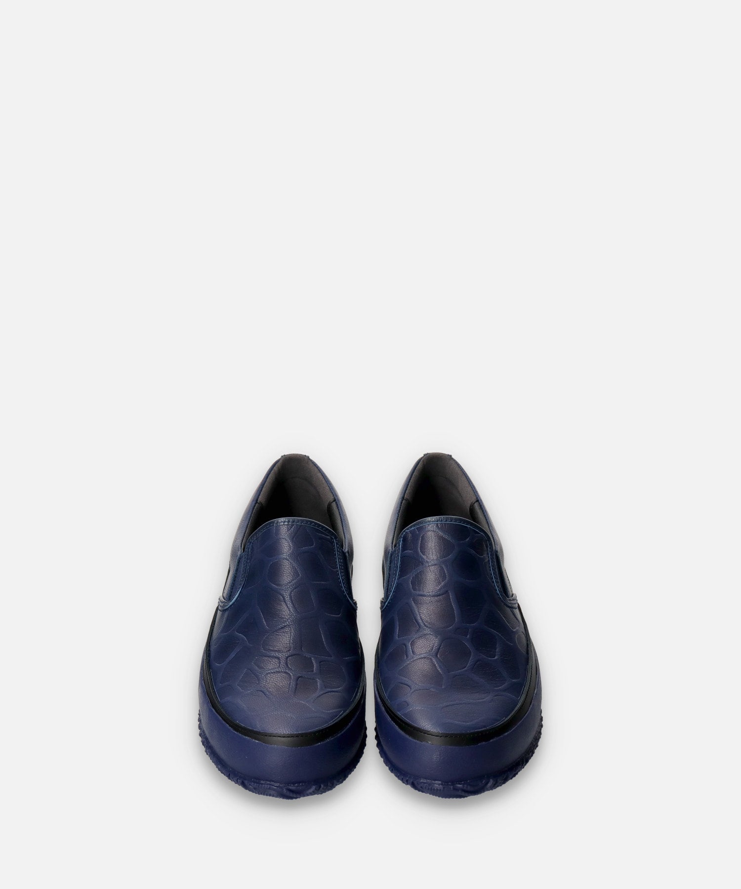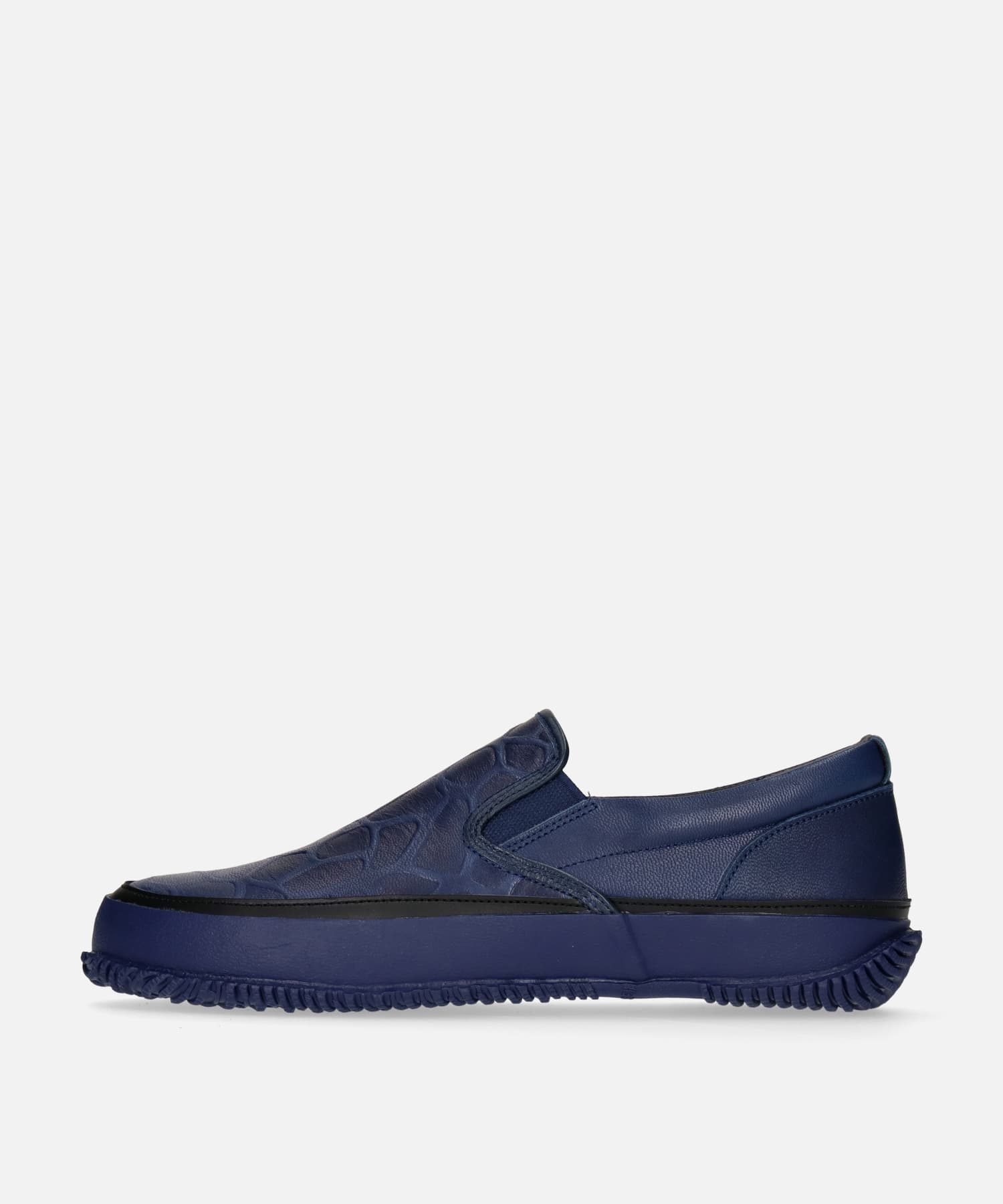 型押しレザーにインディゴ染めを施し、陰影の美しさを引き立てたスリッポンモデル。2025年シーズンテーマ「Circle」のもと、日本の美を提唱する「Japan Beauty」を表現した一足です。アッパーは日本古来から「青は藍より出でて藍より青し」と表現され、ジャパンブルーと称される「藍色」で表現し、インディゴ染め特有の味わい深いムラ感が魅力。甲前面は大柄の型押しで立体感をもたらし、インパクトあるデザインに。フォクシングテープの際にブラックのレザーをあしらい、ワンポイントでデザインを引き締め、洗練された佇まいに。伝統と現代が融合したラグジュアリーなデザインが足元を演出します。
