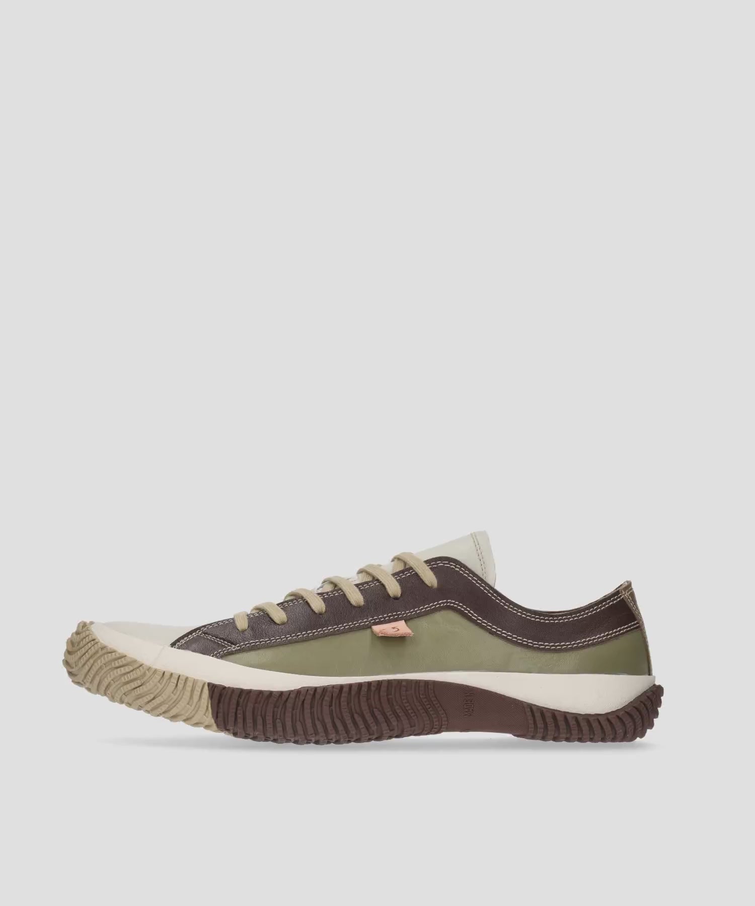 Multiは、スモーキーグリーン、ブラウン、アイボリー、オリーブグレーの4色のカンガルーレザーの切替でアッパーを構成したFunシューズ(クレイジーパターンシューズ)。サンドベージュのステッチとシューレース。オフホワイトのフォクシングテープにアウトソールはブラウンとサンドベージュのスラッシュ切替のツートーン仕様。ブラウンの替え紐で気分やコーディネートに合わせて表情を変えて楽しめるのも嬉しいポイント。