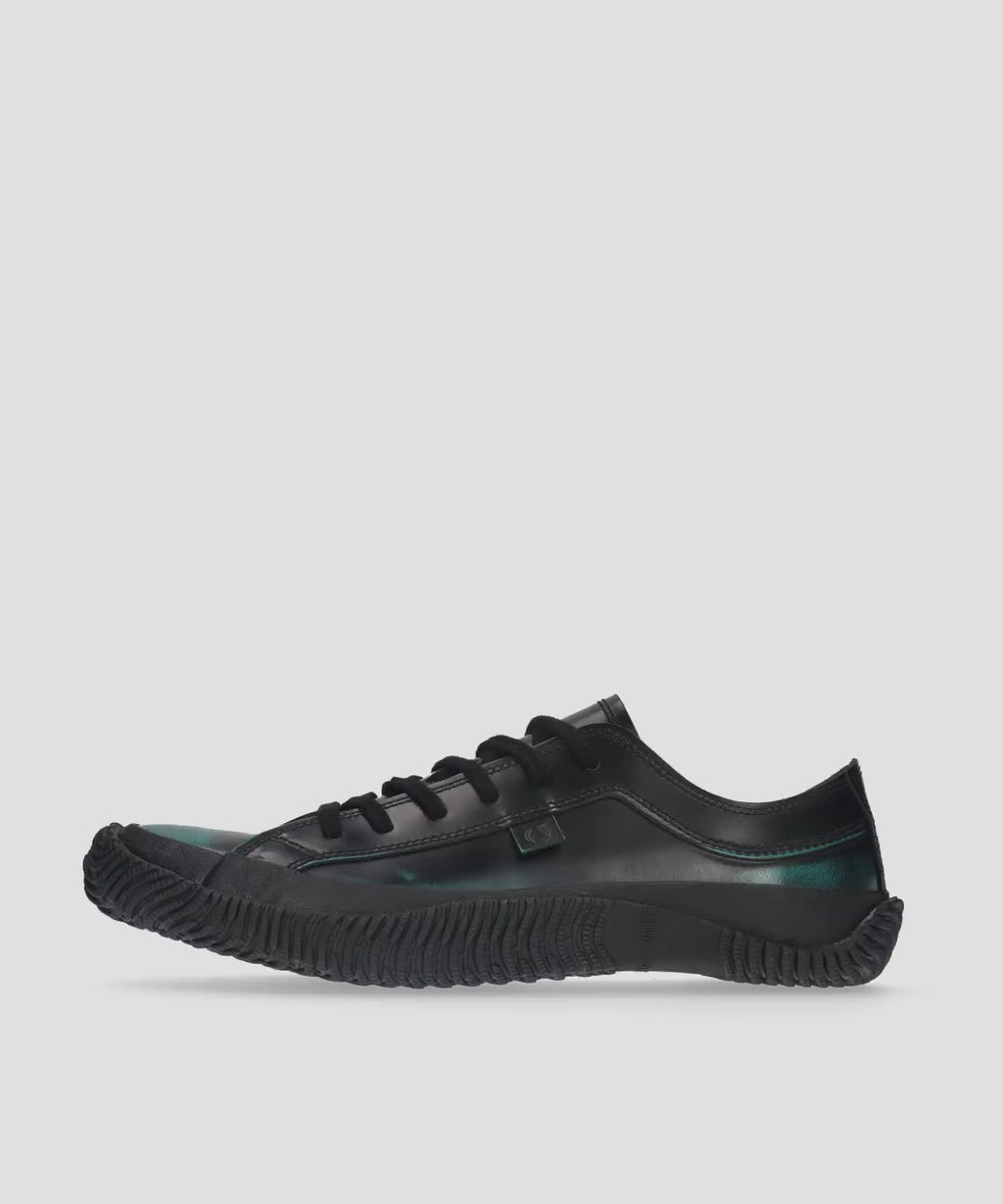 アドバンガラスレザーを使用したドレッシーなローカット。淡色の皮革に濃色の仕上げ液を塗布し、部分的にバフすることで淡色が浮き上がって見えます。職人が手作業で丁寧に色味を調整しているため、一足一足にオリジナルの風合いがあります。