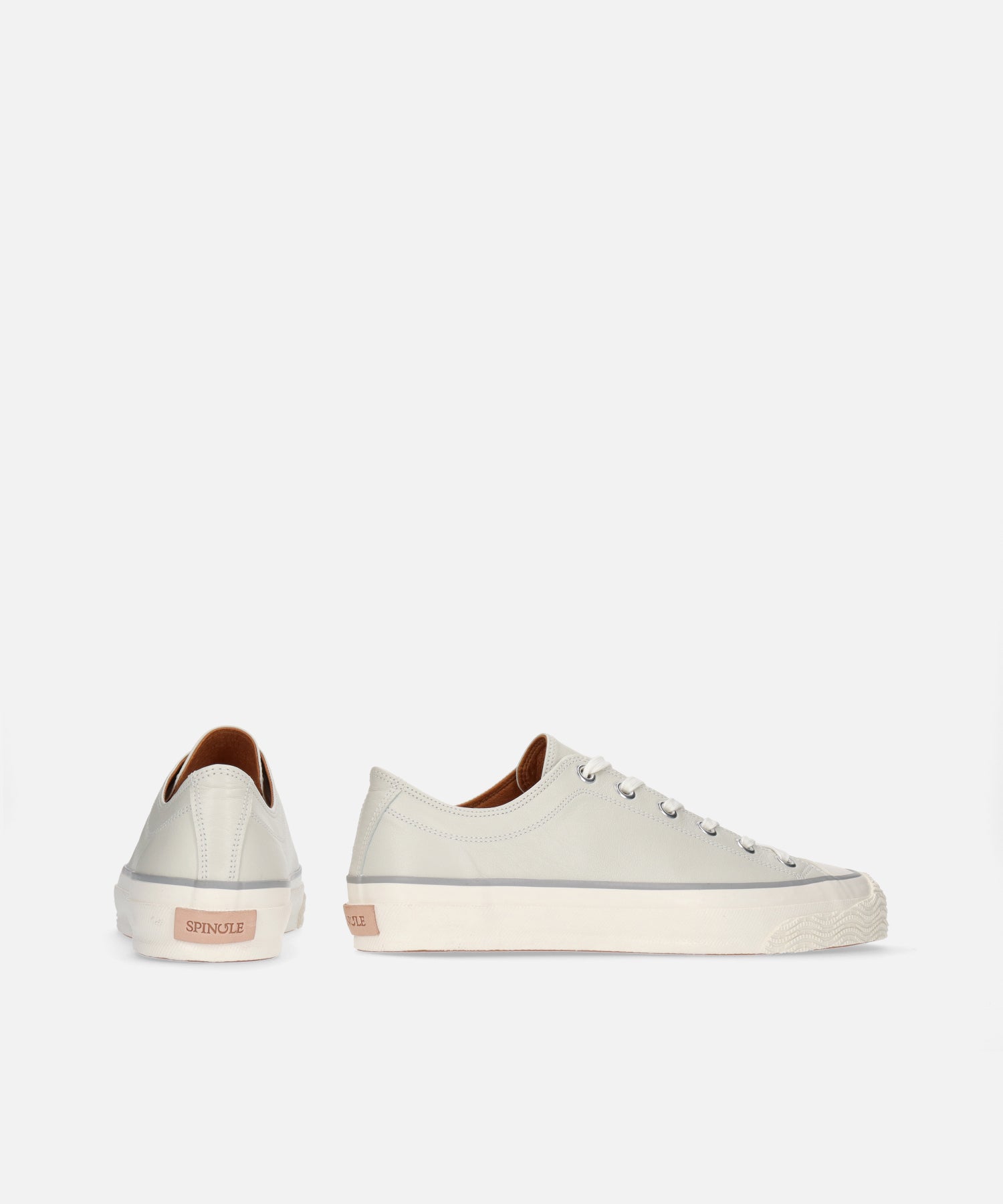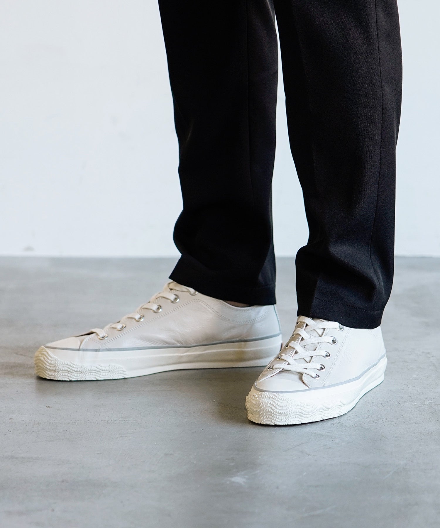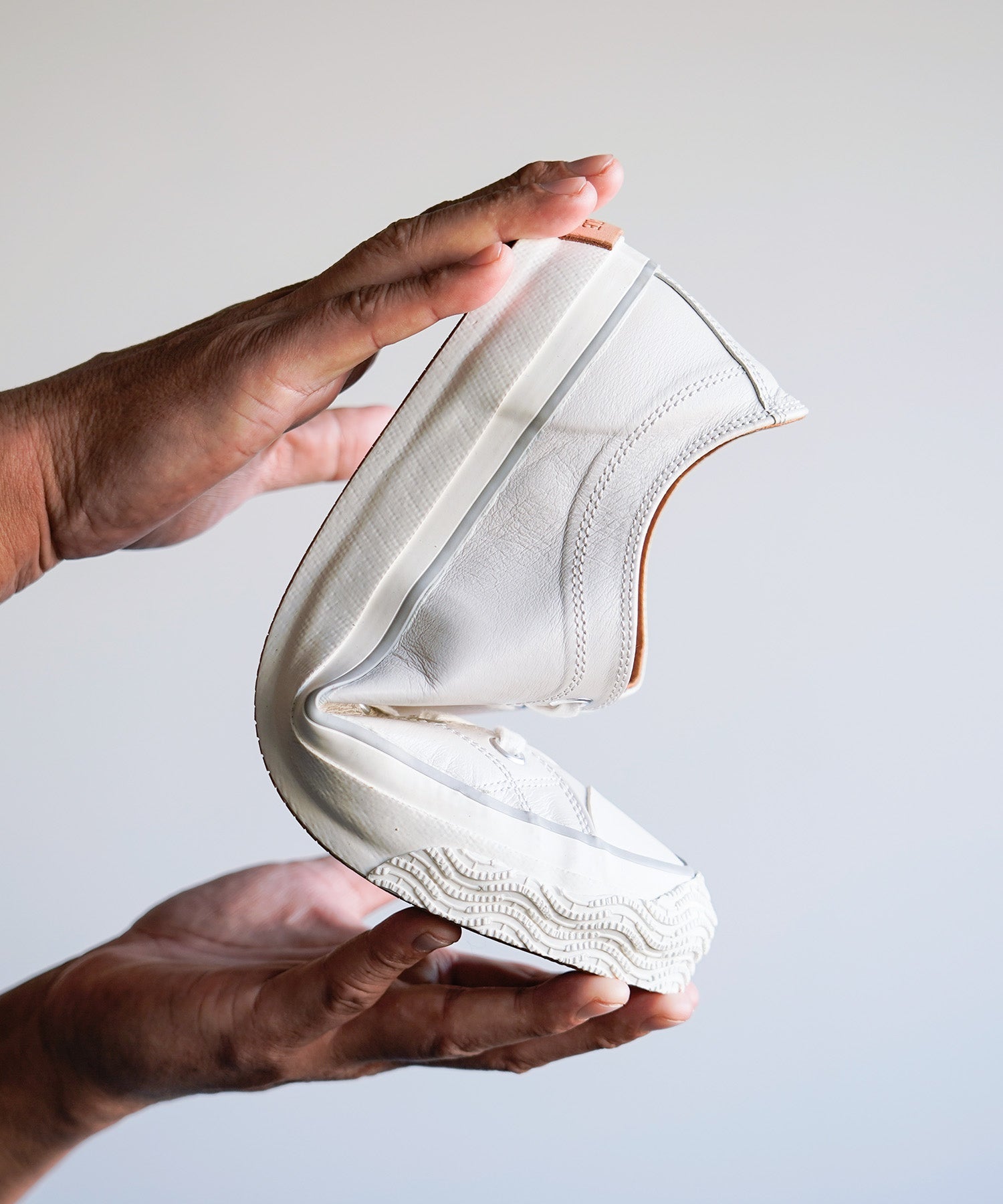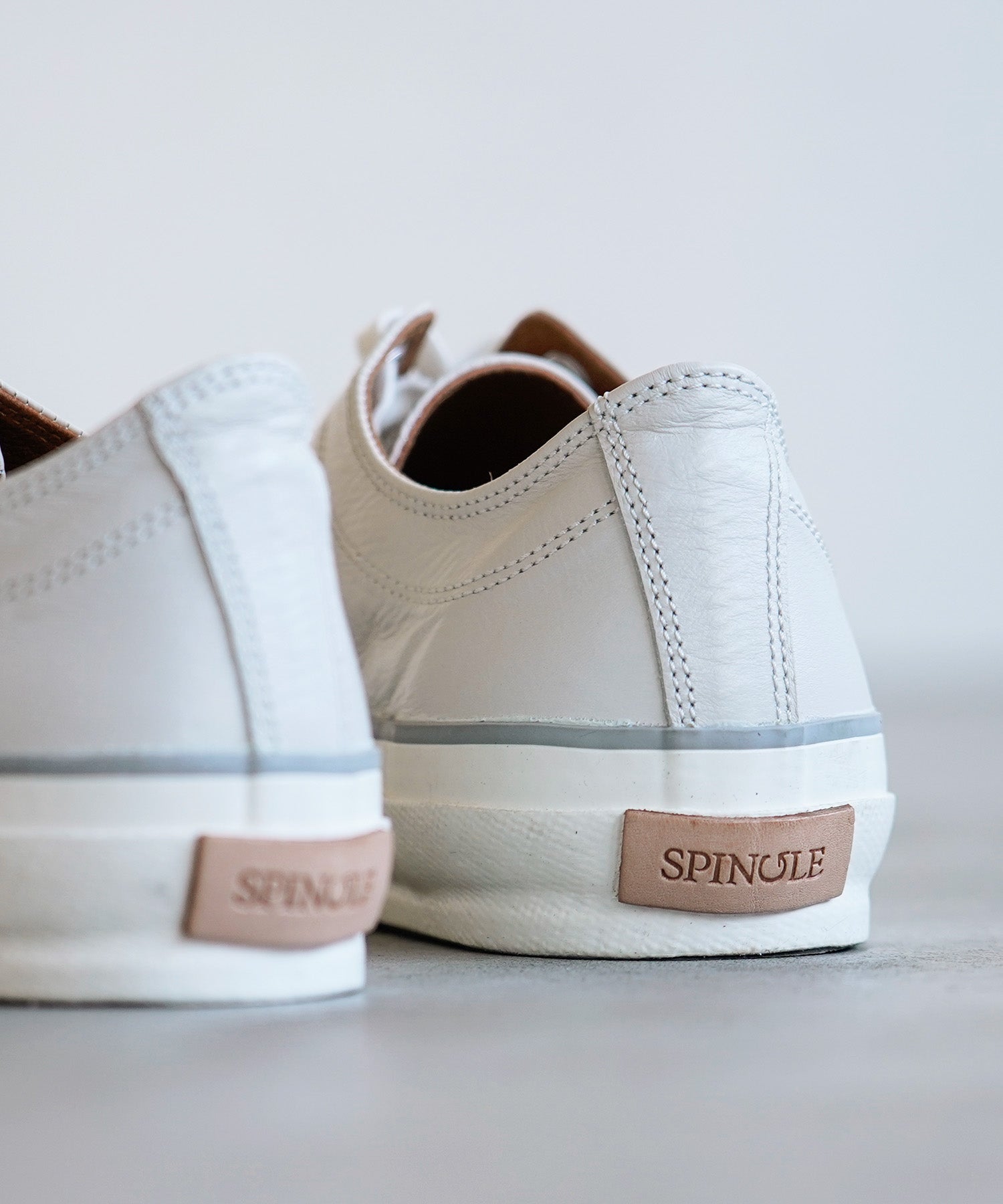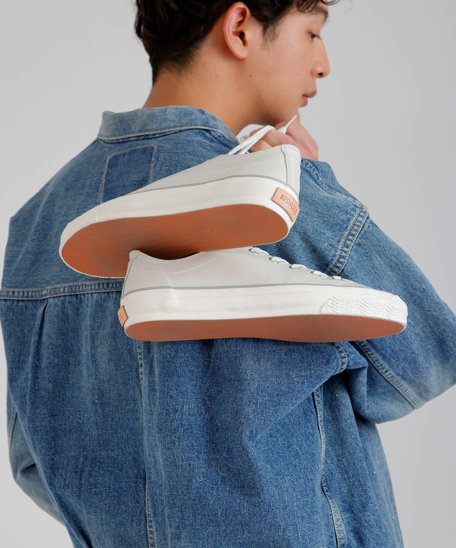 風合いあるカンガルーレザーのアッパー、巻き上げソールをイメージしたトゥーガード、SP-110のステッチワークなど、スピングルの代名詞を詰め込んだローカット。ヌメ革のヒールパッチにはロゴが入り、後ろ姿のアクセントに。ソールには当社ソールブランド「RUBEAR」のNRソールを採用し、天然ラバーの柔らかさとしなやかさはそのままに弾力性と耐摩耗性を向上させました。
