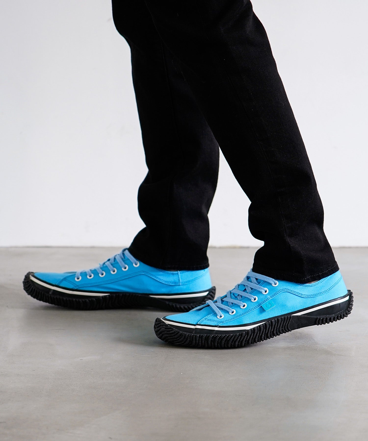 JAPAN MADEにこだわった最高級帆布生地ブランド「富士金梅®」の8号帆布を使用したスニーカー。職人の手作業が必要なシャトル織機で丁寧に織り上げており、綿100%で程よいハリとコシがある帆布です。撥水加工を施しているので、汚れにくく雨や水濡れにも安心。サックスブルーのアッパーにブラックソールのコンビでメリハリのあるカラーが好印象。