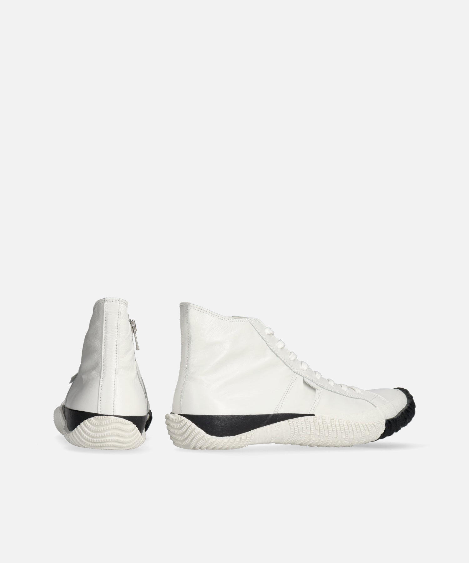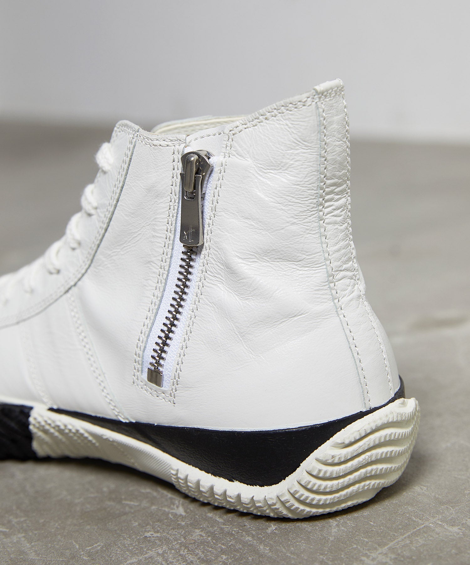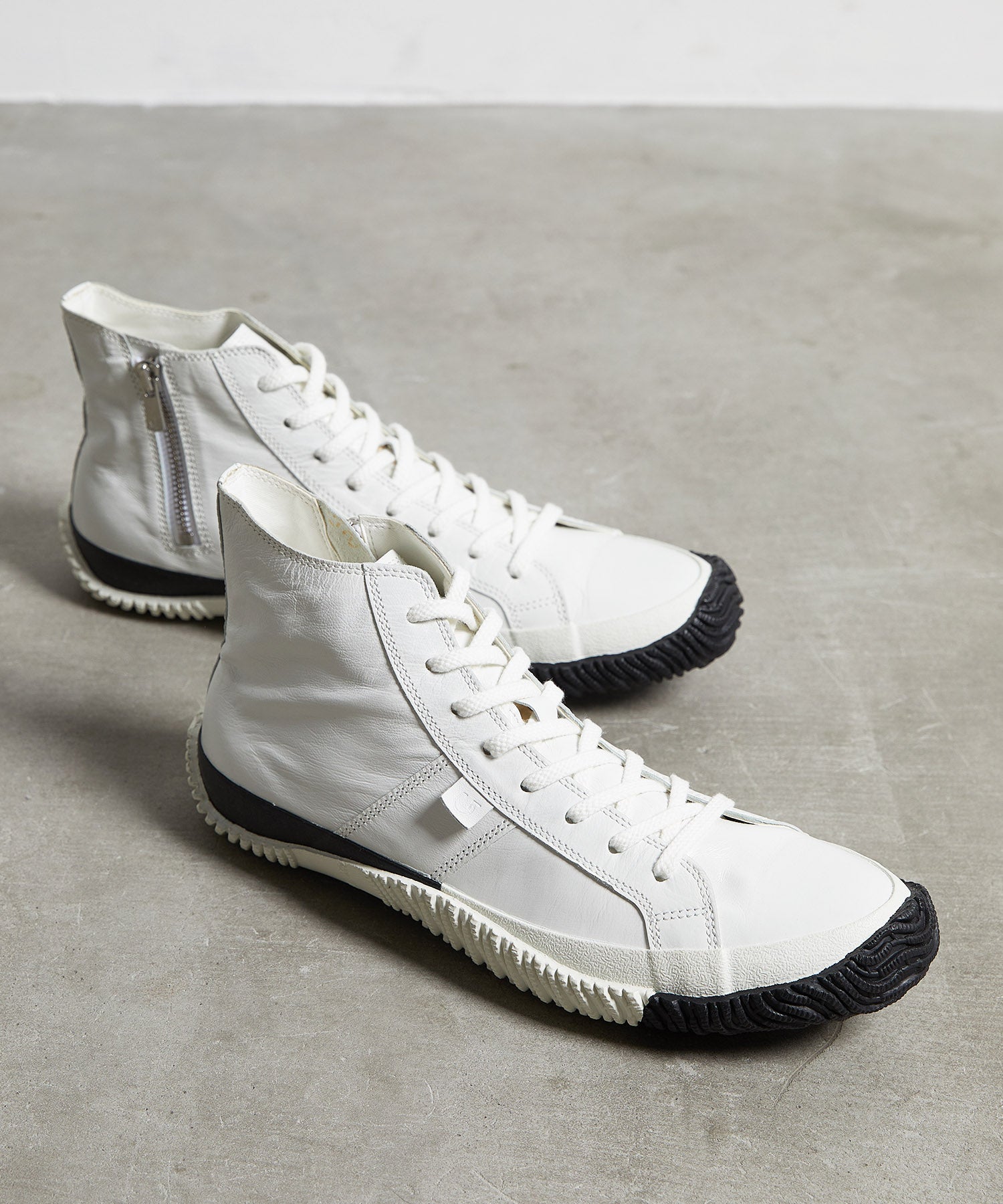 履き心地の良いカンガルーレザーのハイカットに、バイカラーのフォクシングテープとアウトソールでアクセントを加えた一足。 カンガルーレザーは柔らかさ・高い強度・軽さを兼ね備えており、その特徴から野球やサッカーのスパイクとしても使用されている人気素材です。内側にファスナーを付けてアクセントにしています。Shiro/Kuroシリーズは2024年のホリデーシーズン限定カラー。白と黒のコントラストが足元に洗練された存在感をプラスします。