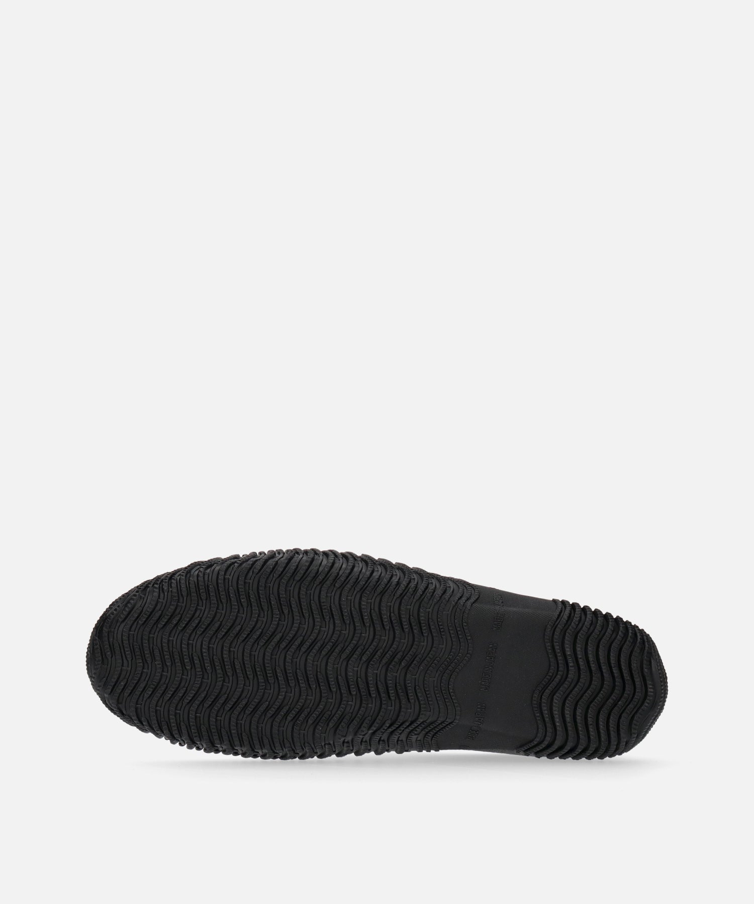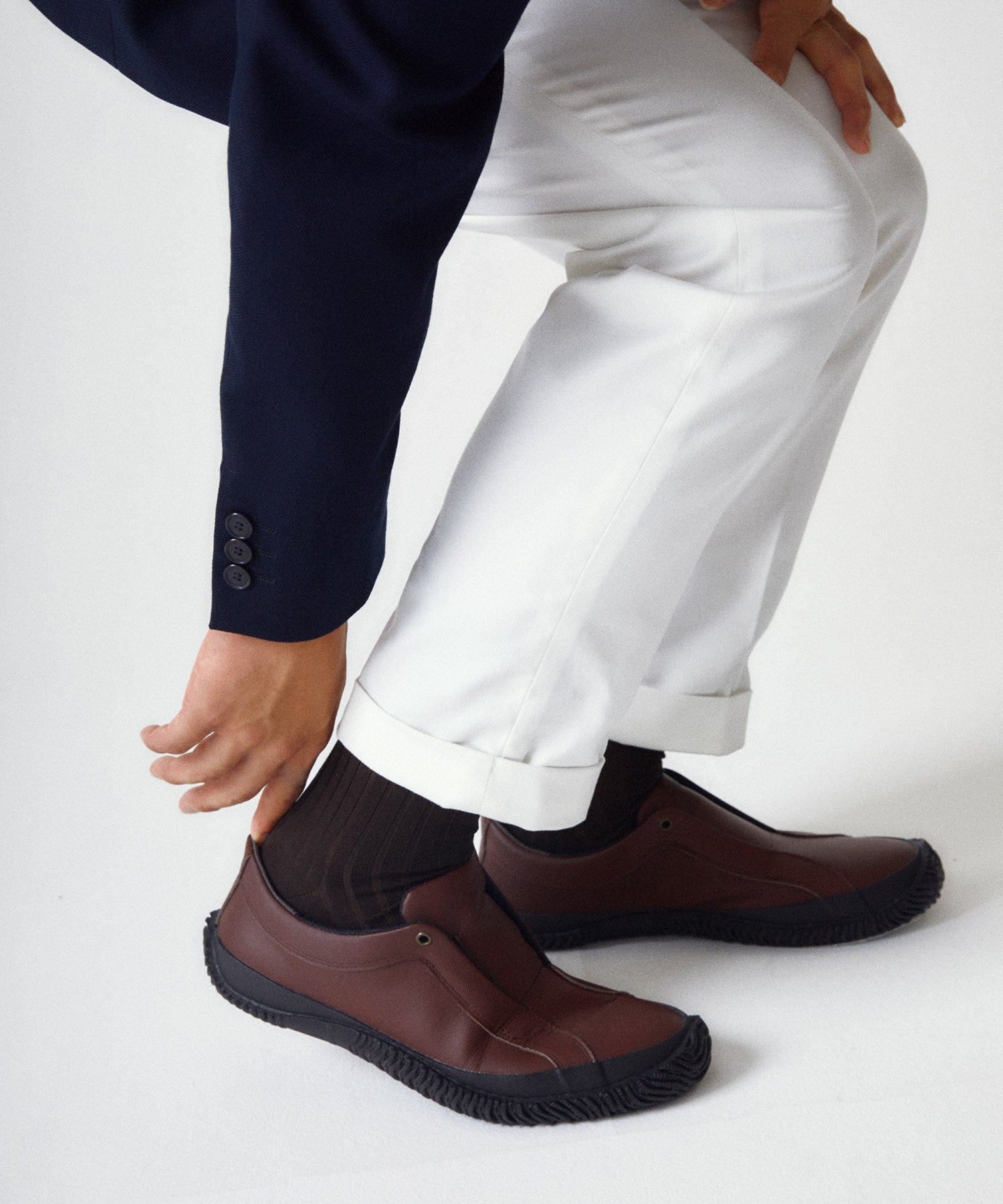ベロにSPINGLEのロゴが型押しされたレザースリッポン。ライニングには消臭・抗菌・吸湿機能を持つ「COOL MAXIM」を採用。ベロ、履き口周りにはパッドを入れて、足当たりの良さを追求しています。