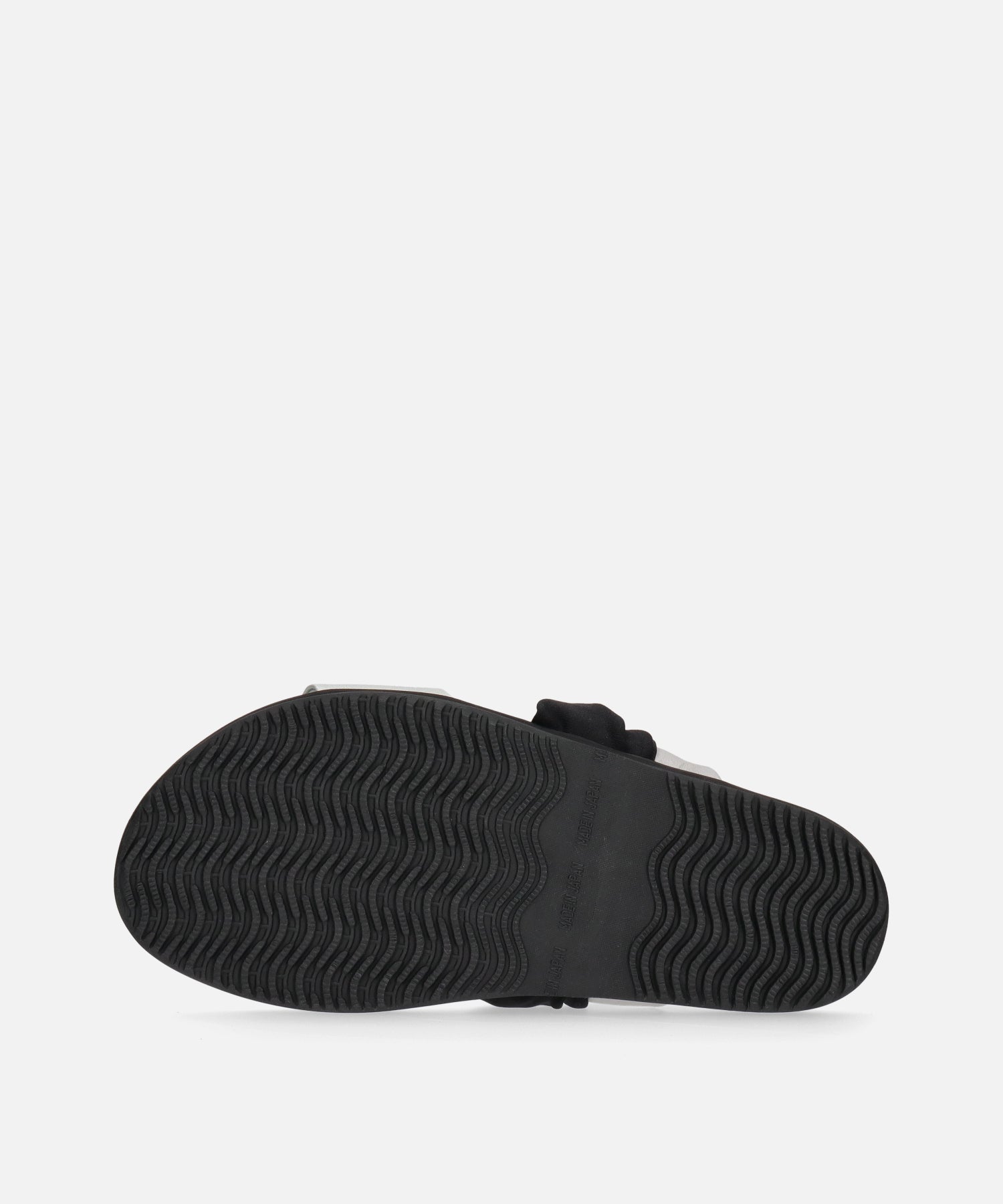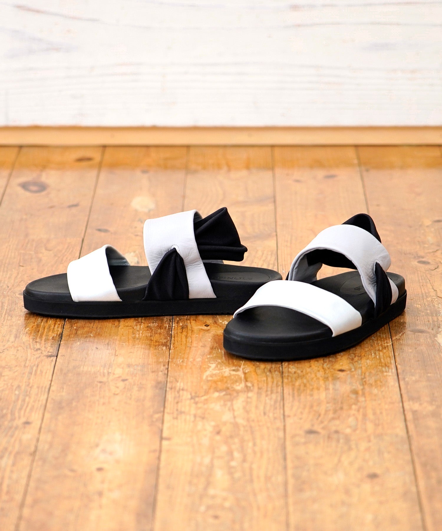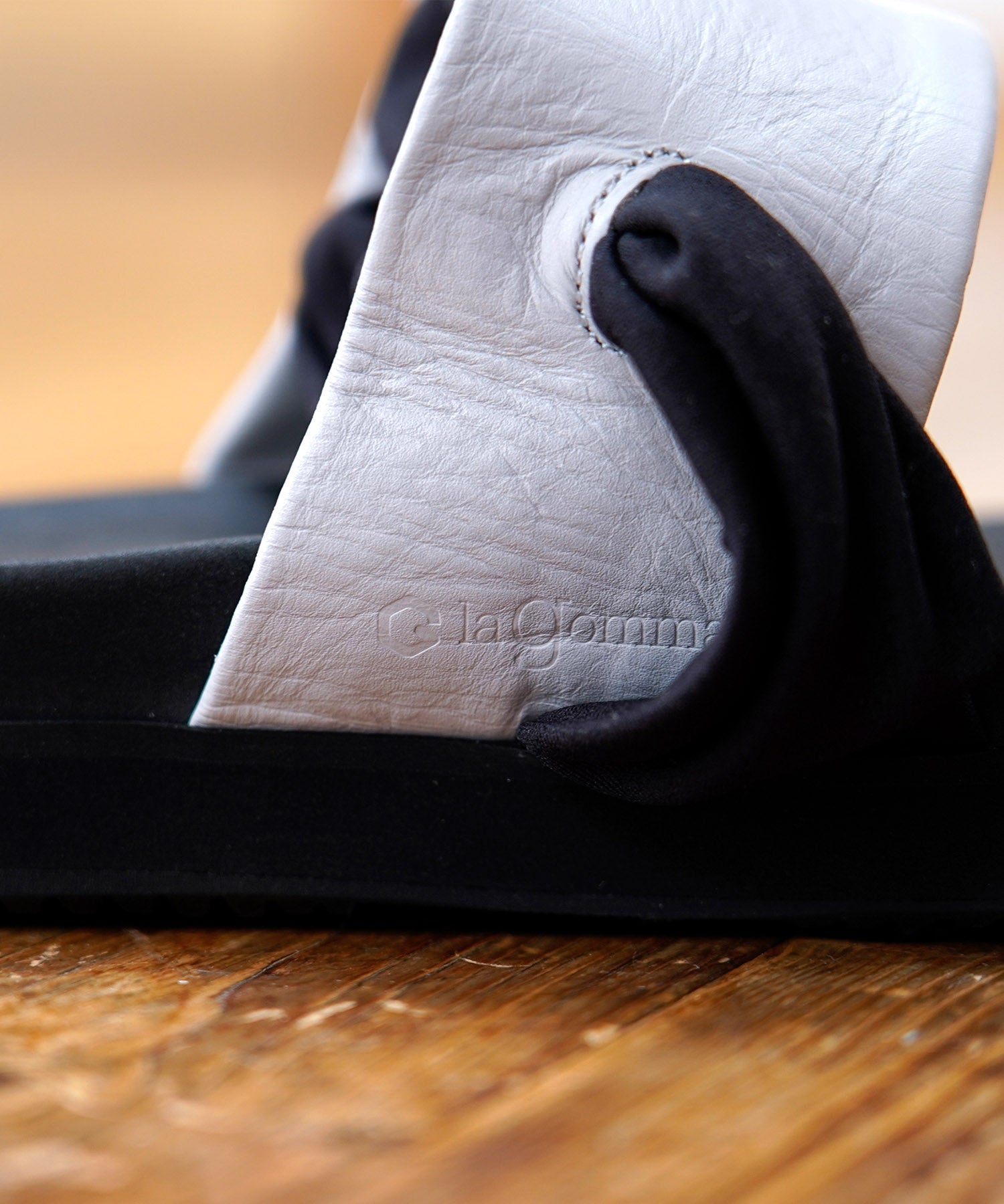 神戸の老舗シューズメーカー「la gomma」と共同開発したストラップサンダル。ダブルストラップに加え、かかとをホールドするストレッチ素材のストラップを組み合わせ、ストレスフリーな履き心地。艶のあるカウレザーで高級感ある大人のサンダルに仕上げました。アッパーの内側に「la gomma」の型押しロゴ入り。