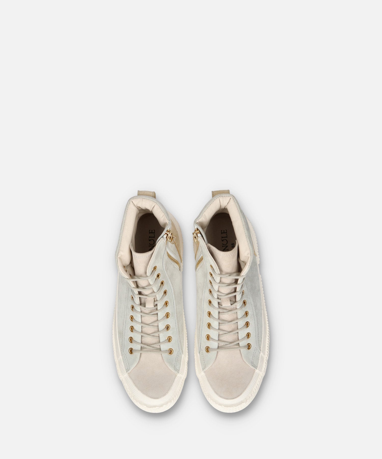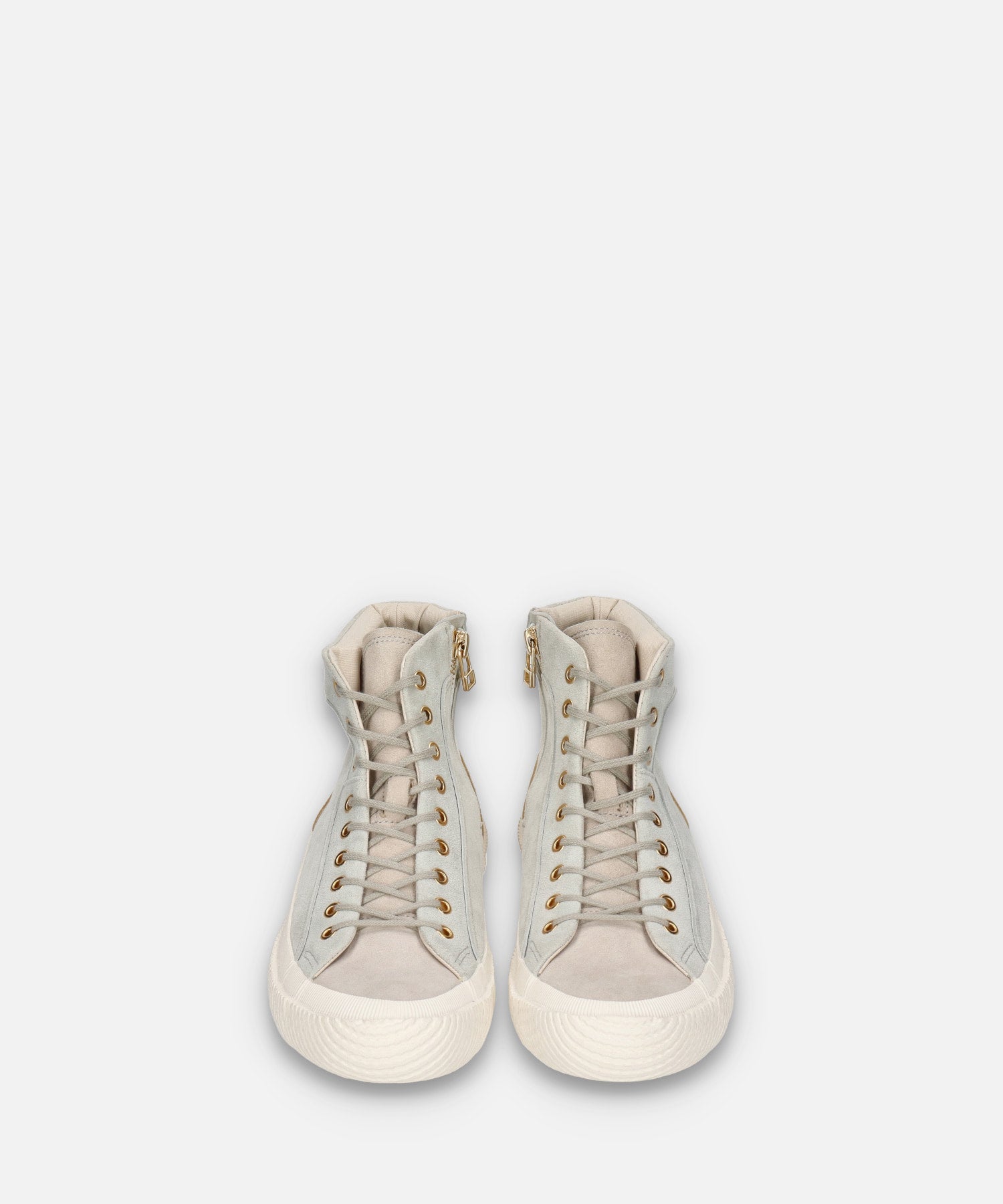 柔らかいタッチのゴート(山羊)スエードを使用し、アイスブルーを基調にした配色のハイカット。ゴールドのハトメとファスナーでラグジュアリーさを演出しています。