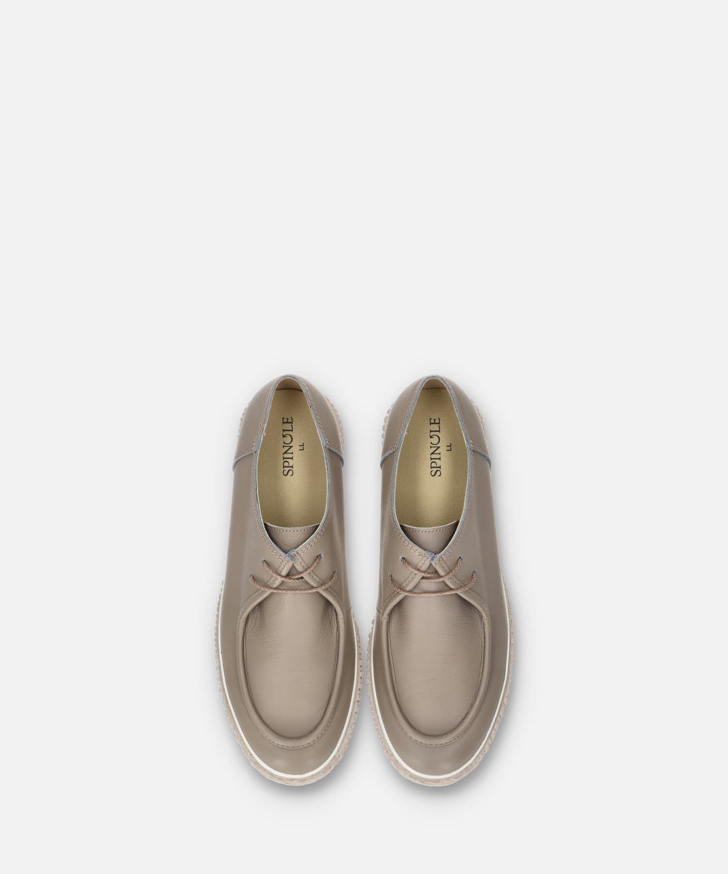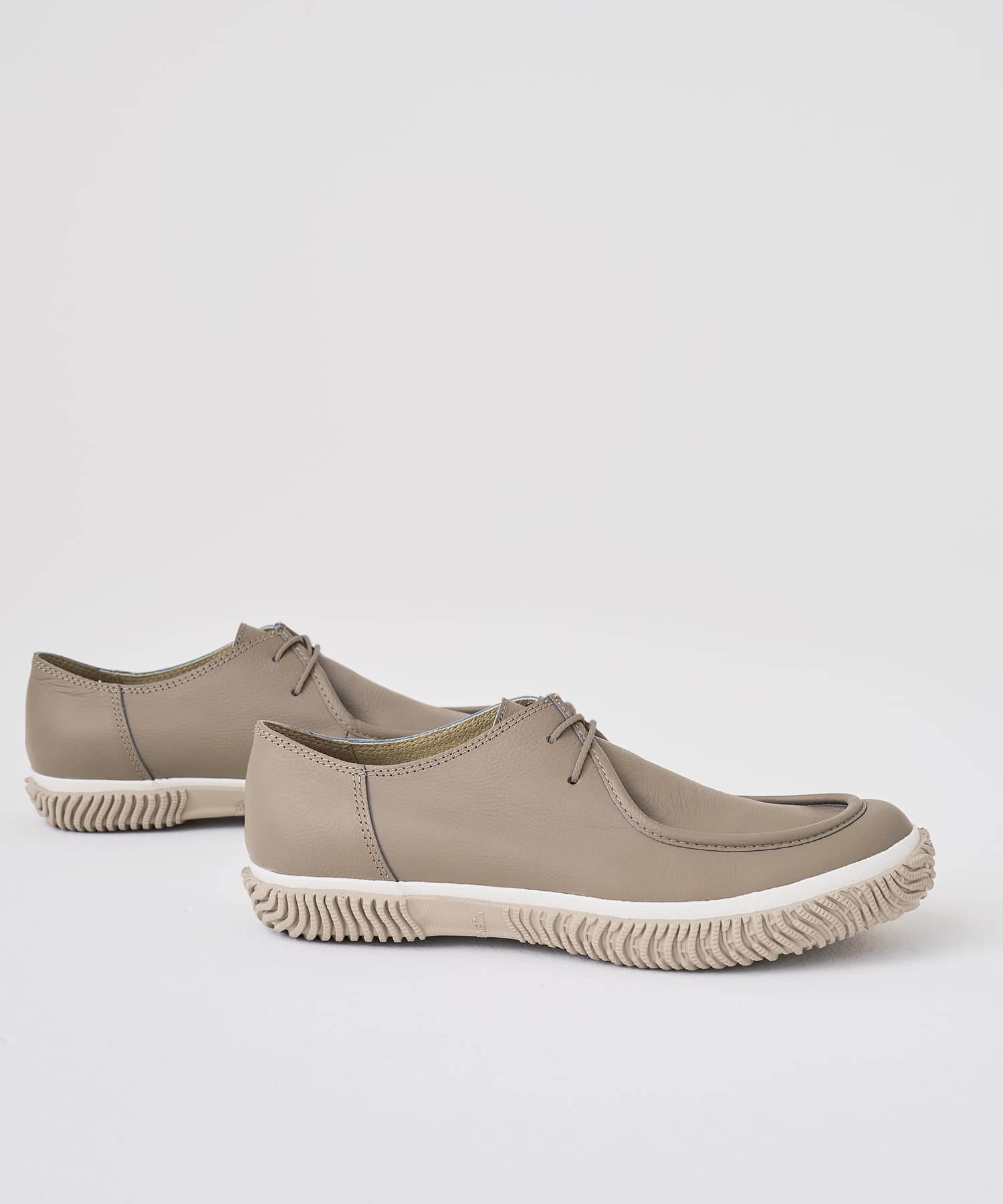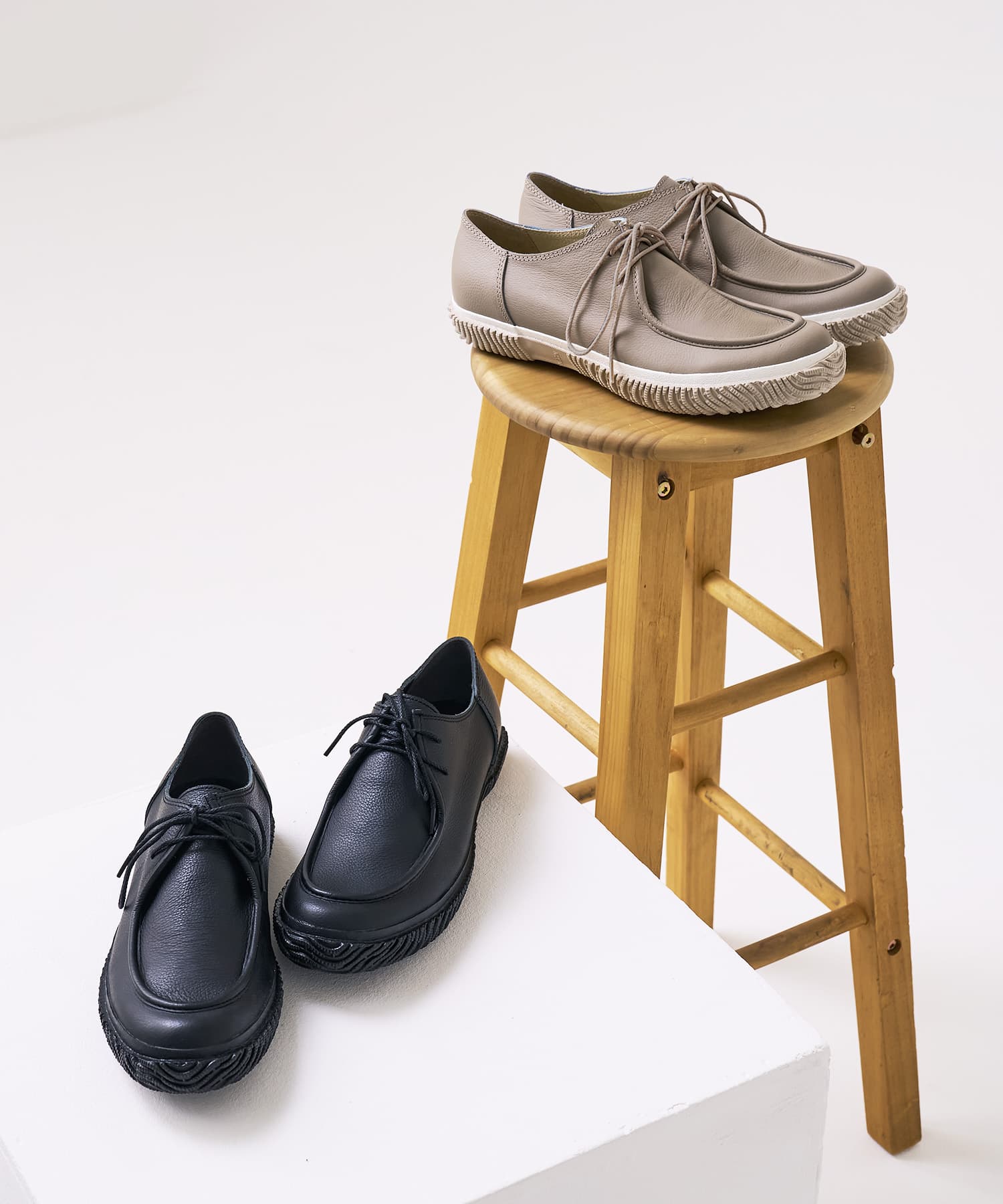 トゥ部分のモカシン縫いが特徴的なチロリアンテイストなデザインに、スピングルの代名詞である巻き上げソールを合わせました。丁度くるぶしの下辺りにおさまる履きやすい丈感でコーディネートしやすく、適度なカジュアル感と歩きやすさを兼ね備えています。アッパーにはシボの入った牛革を使用し、柔らかなレザーとクッション性のあるインソール、屈曲性の高いアウトソールが足を優しく包み込みます。