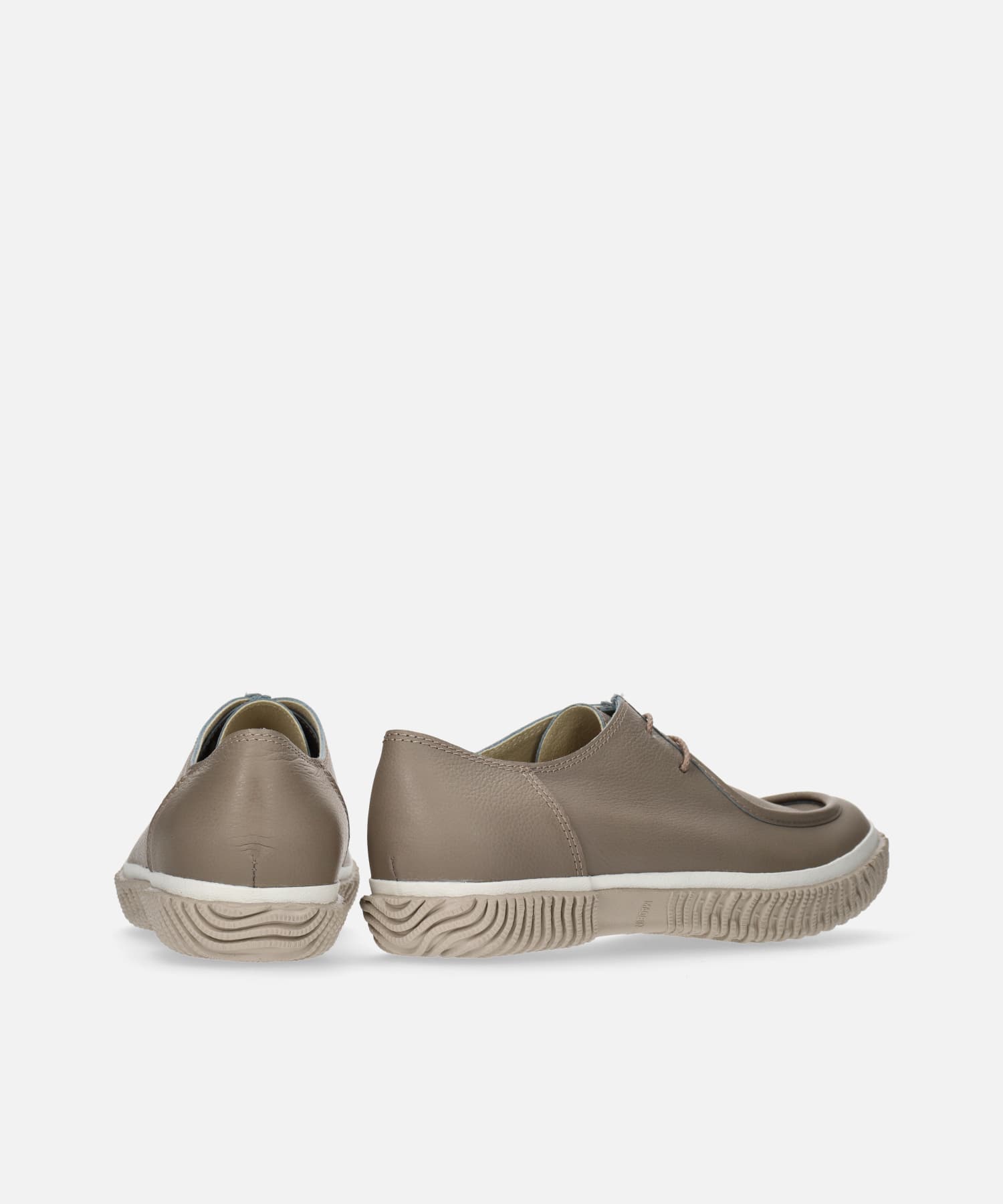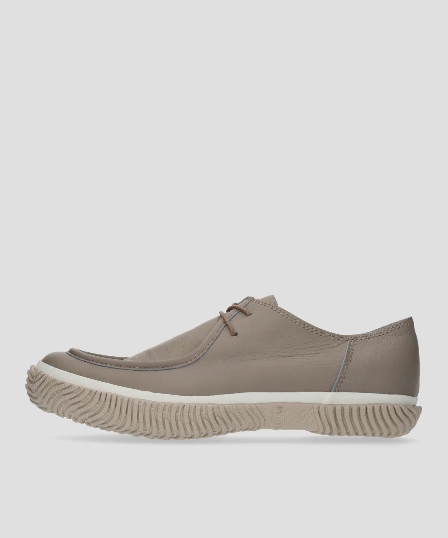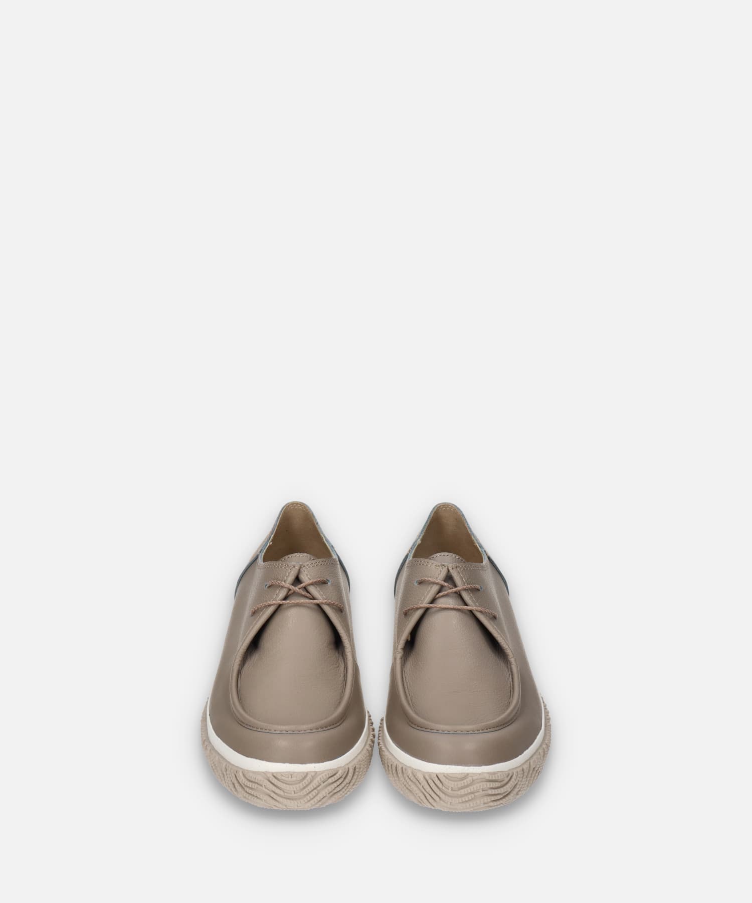 トゥ部分のモカシン縫いが特徴的なチロリアンテイストなデザインに、スピングルの代名詞である巻き上げソールを合わせました。丁度くるぶしの下辺りにおさまる履きやすい丈感でコーディネートしやすく、適度なカジュアル感と歩きやすさを兼ね備えています。アッパーにはシボの入った牛革を使用し、柔らかなレザーとクッション性のあるインソール、屈曲性の高いアウトソールが足を優しく包み込みます。