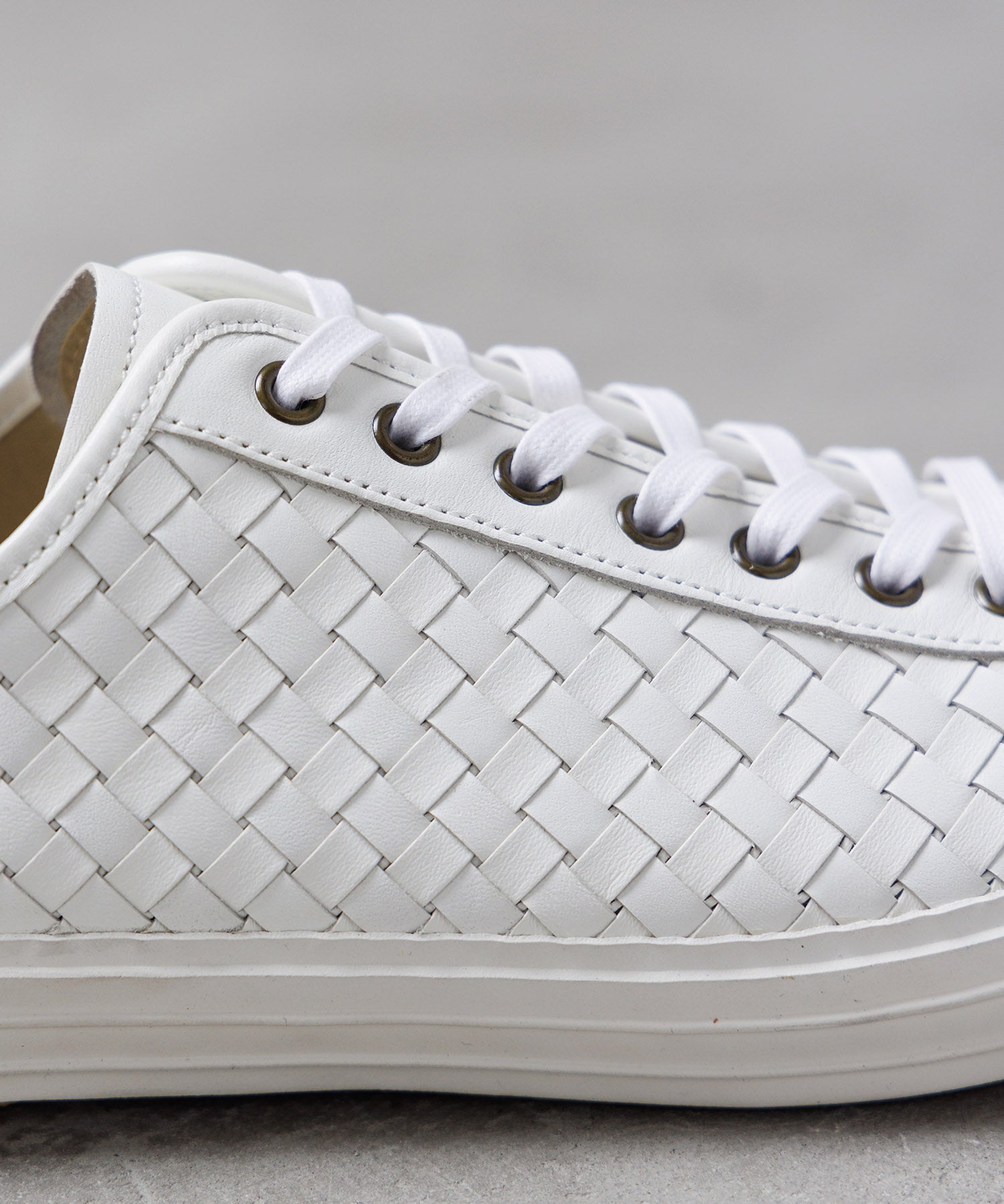 高級なレザー差しメッシュを使用したローカットモデル。アッパーにはイタリアのトスカーナ地方に古くから伝わる技法、イタリア語の「編まれた」を意味する言葉「イントレチャート」デザインを採用。