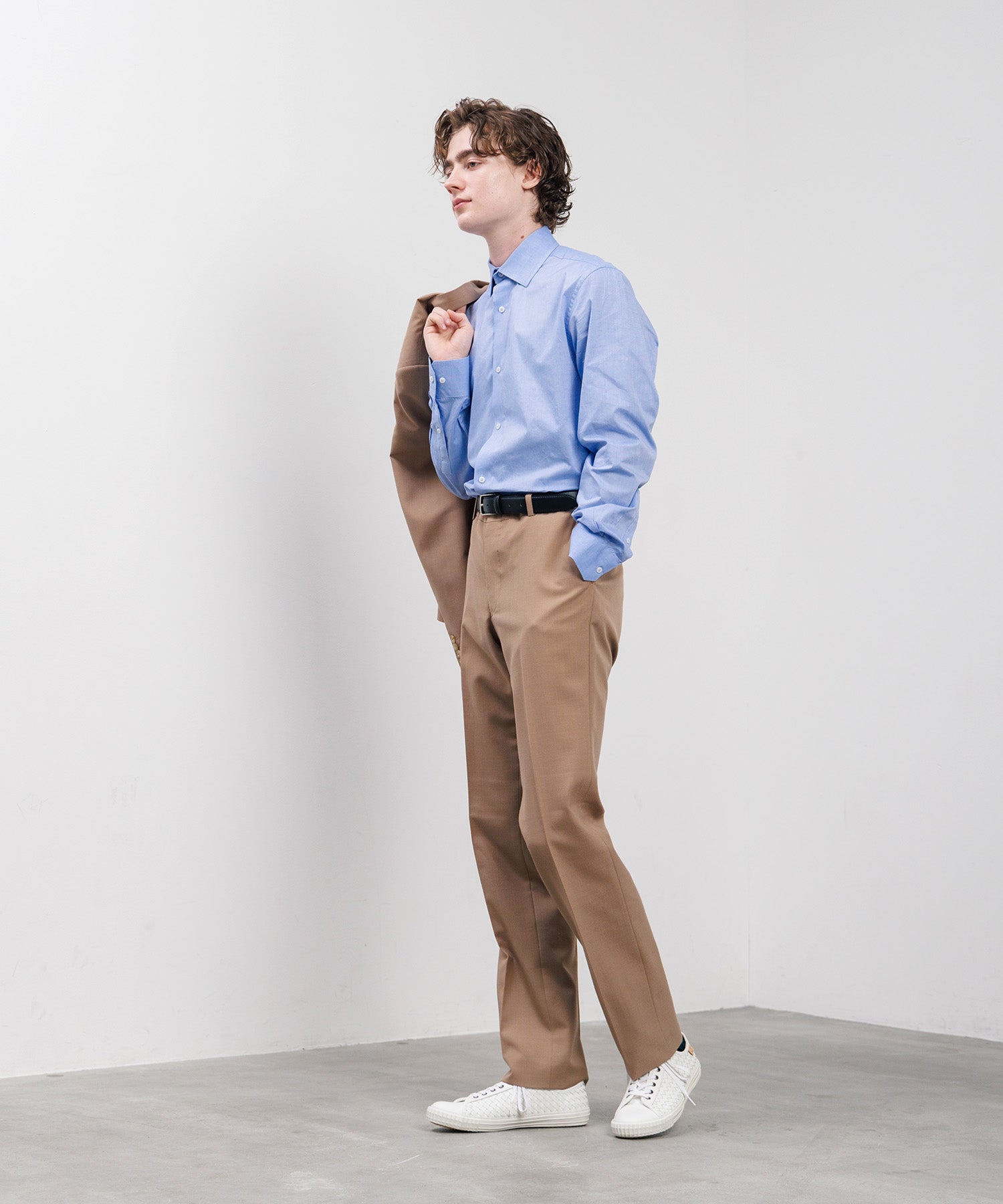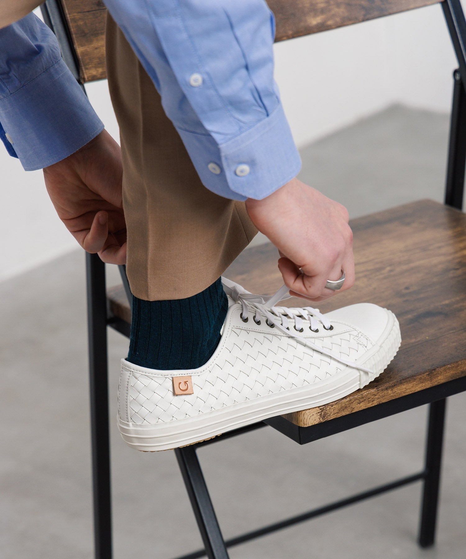 切れ目を入れた一枚の牛革に、紐状に裁断した革を職人が手作業で一本一本差し込みながら編む、手の込んだ素材です。編み込みのレザーのアッパー、クッション性のあるインソールと屈曲性の高いアウトソール全体で、足をふわっと優しく包み込みます。