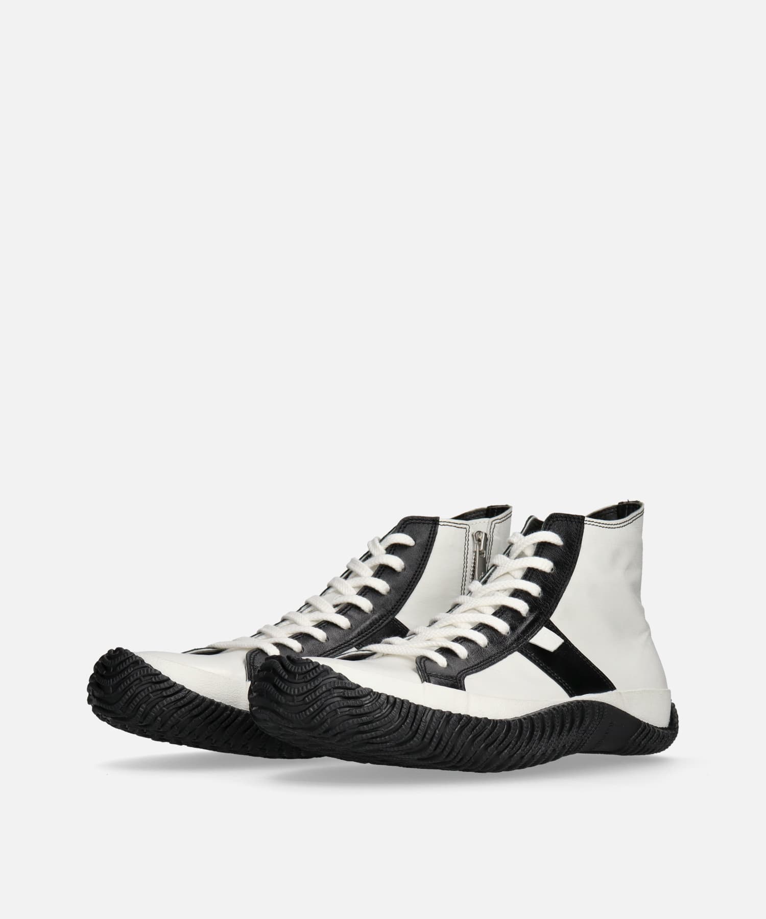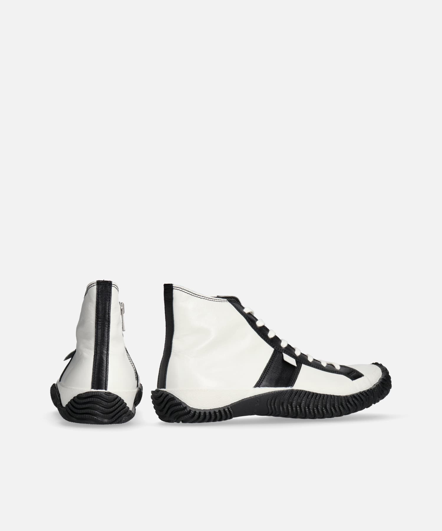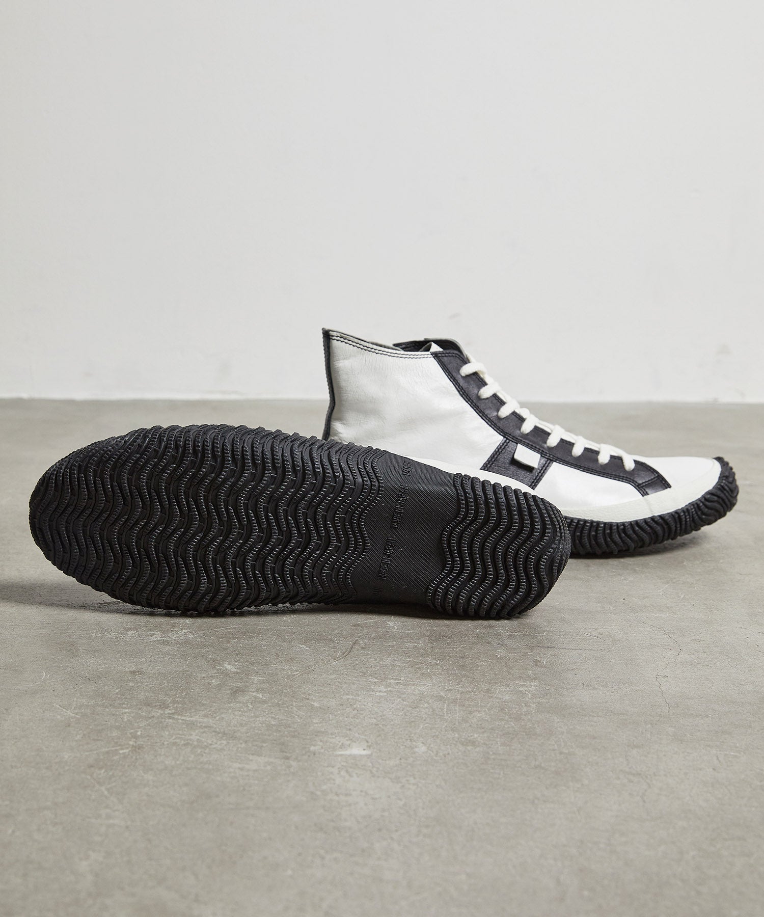 SP-443は、スピングルを代表するモデルの一つ。足首周りまで包み込むハイカットシルエットと内側サイドジップのアクセントで、控えめながら存在感のあるデザインに仕上げています。