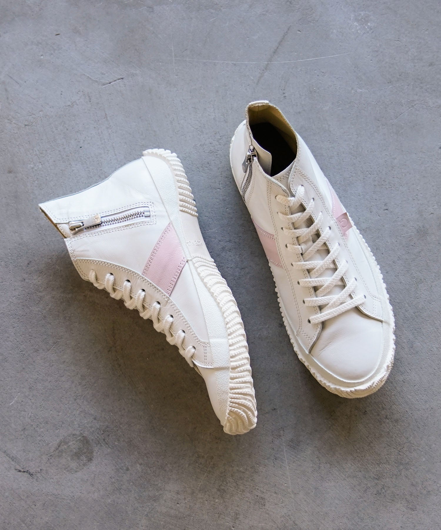 SP-443は、スピングルを代表するモデルの一つ。足首周りまで包み込むハイカットシルエットと内側サイドジップのアクセントで、控えめながら存在感のあるデザインに仕上げています。