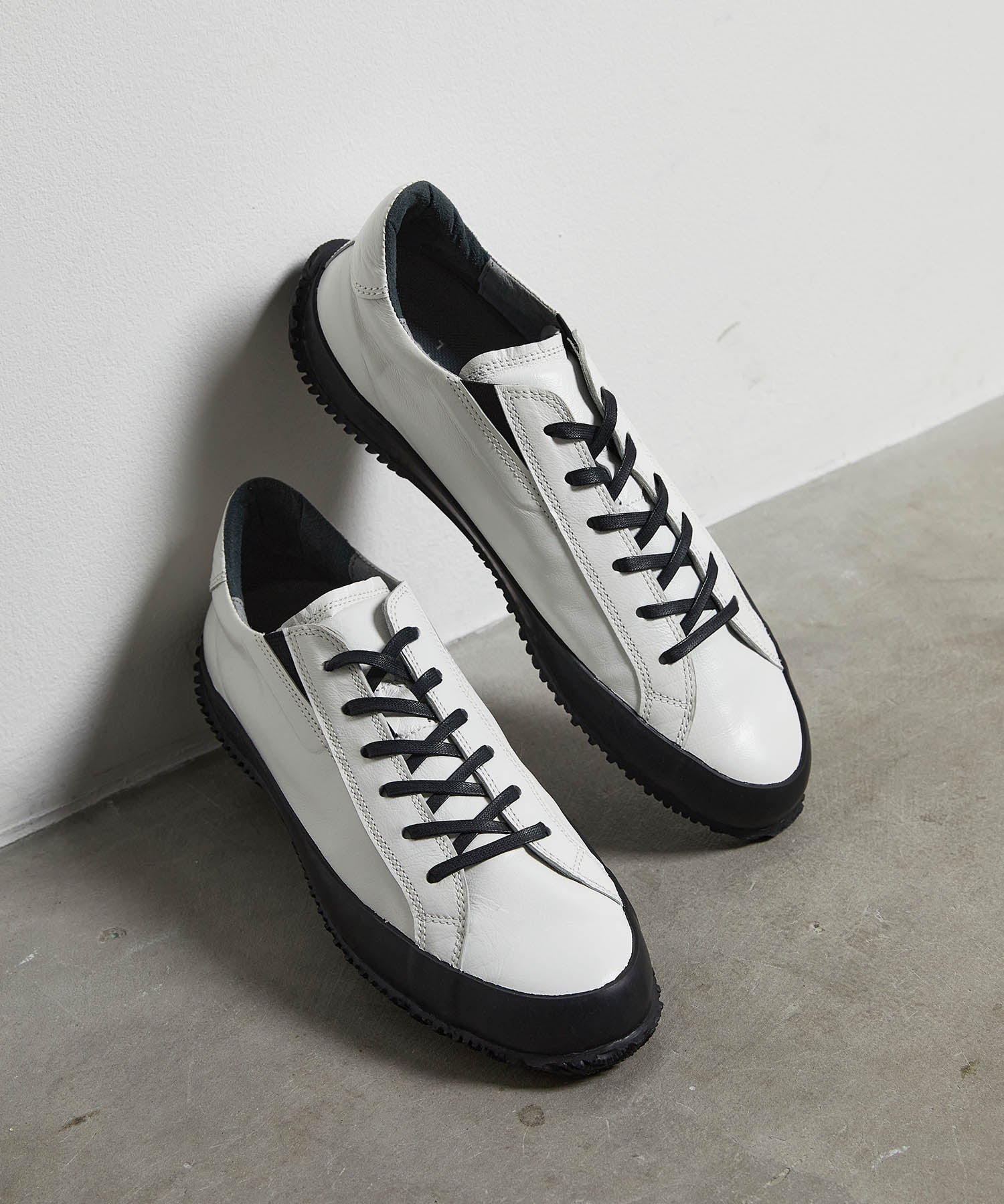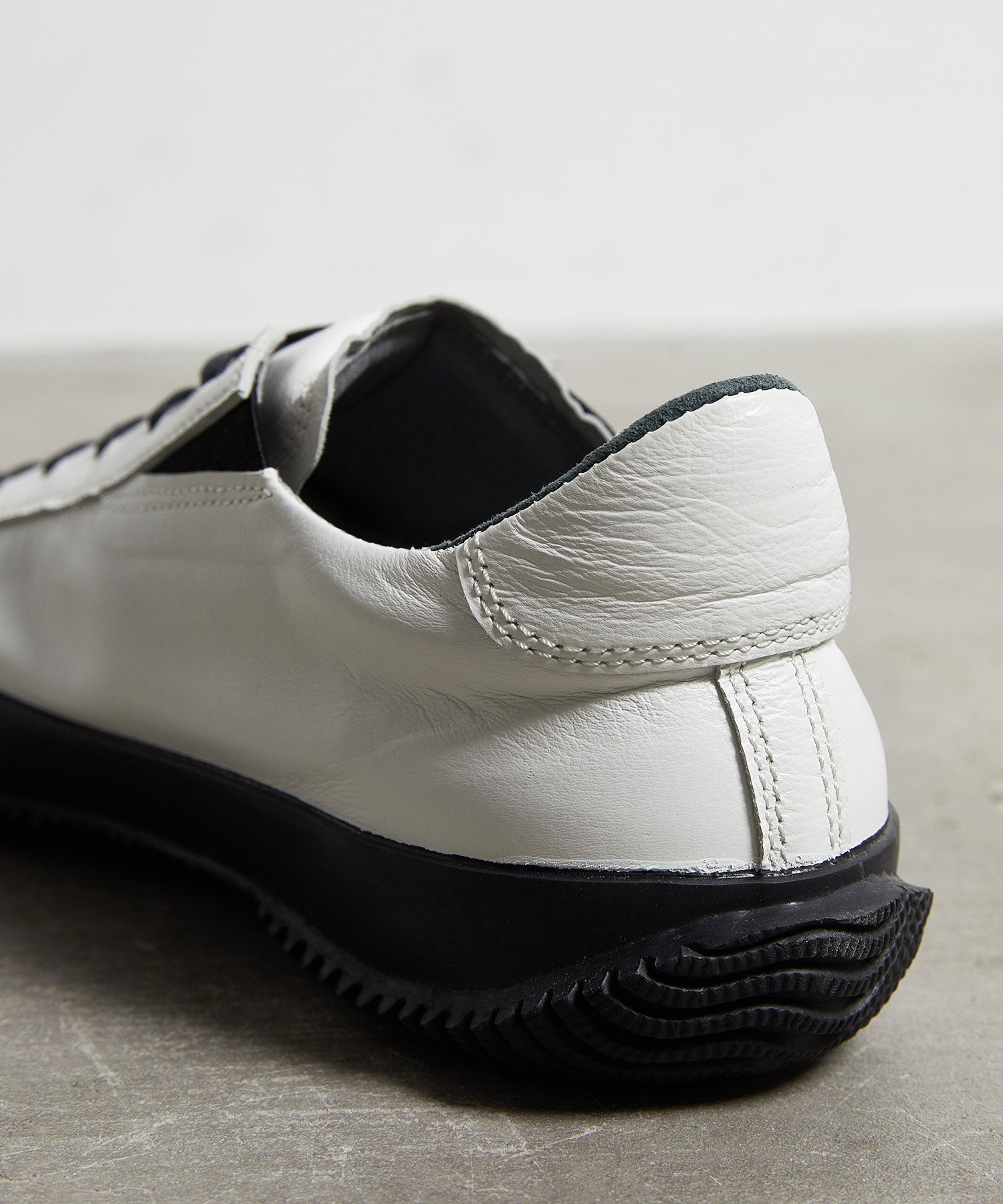 軽く柔らかなカンガルーレザーを使用したコートタイプ。多様化するビジネスシーンからプライベートまで、幅広く合わせやすいデザイン。スリット状に入ったサイドゴアが脱ぎ履きをサポートし、ベロ上部と履き口のパッドは優しい足当たり。安定した履き心地を考慮して、カップインソールの踵のくぼみと硬度も調整しました。フットベットライニングには、吸水・拡散・抗菌・抗ウイルス性能を兼ね備えた機能性リサイクル素材「ECOPET®」採用。アウトソールのサイドに型押しロゴ入り。
