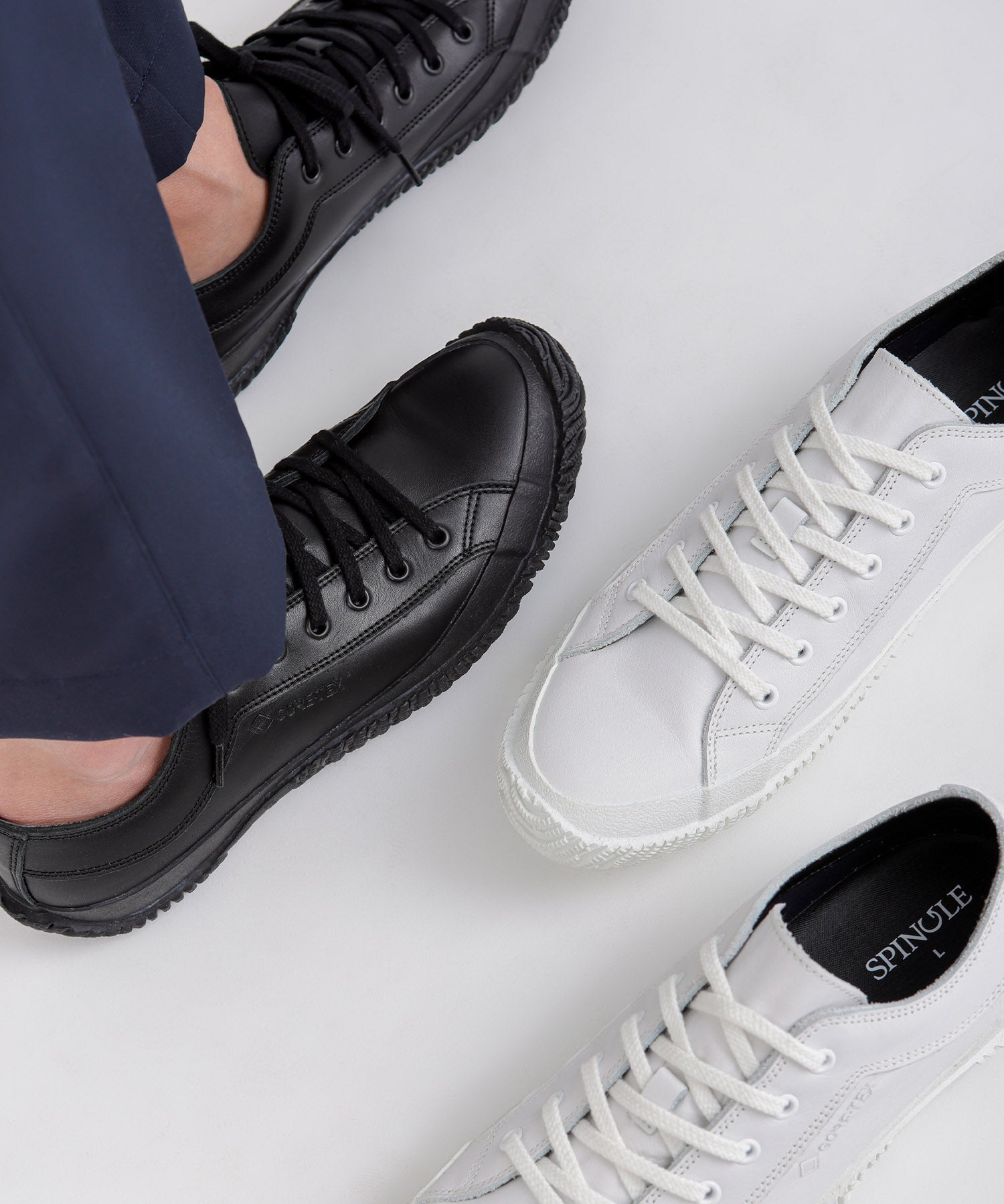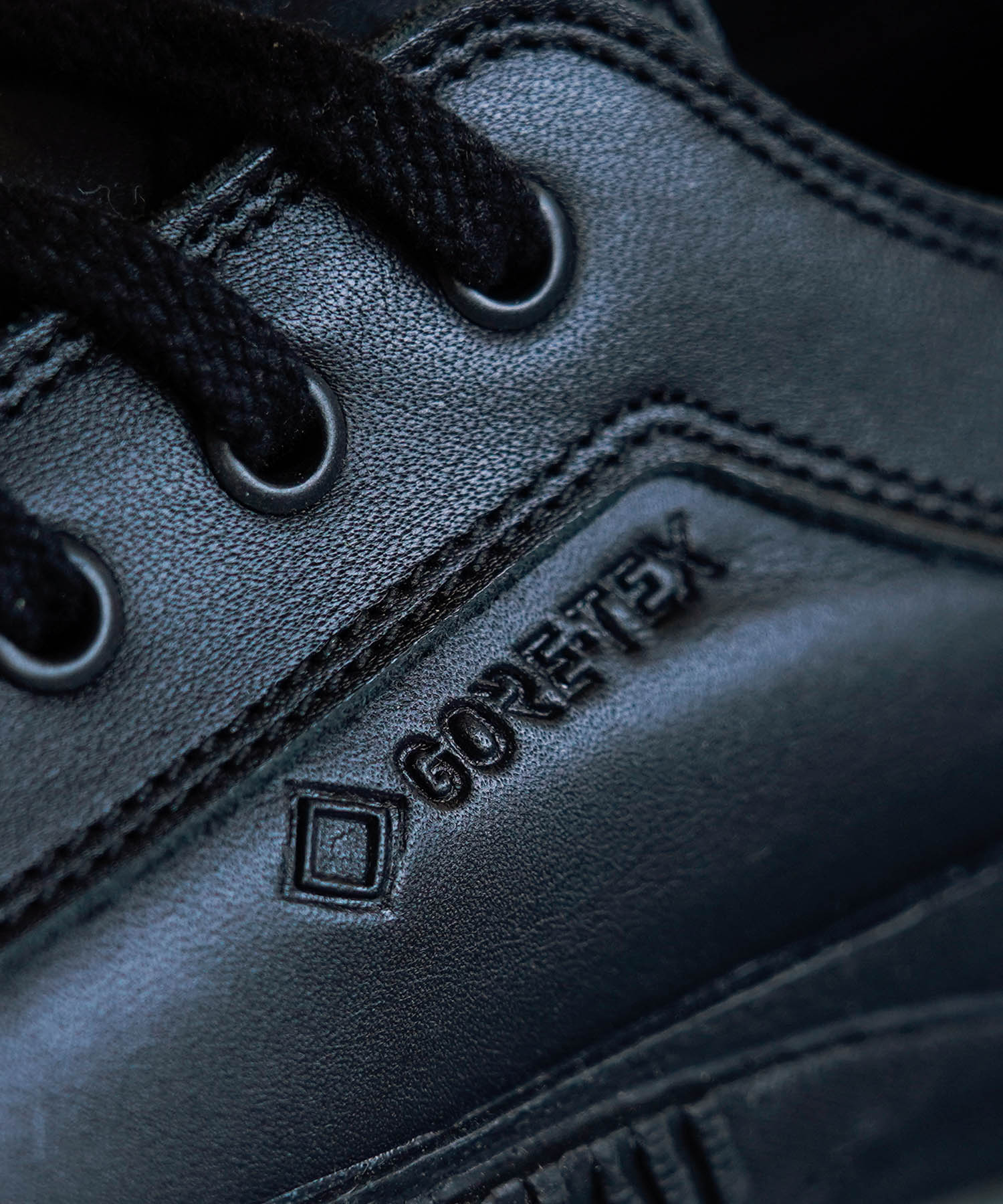 防水透湿機能に優れたゴアテックス素材のローカット。水に濡れても靴内環境を快適に保ちます。羽根の内側には水かきが付いており、隙間からの浸水もブロック。シューレースにまで撥水加工を施し、細部まで防水仕様としてこだわっています。サイドに素押ししたゴアテックスロゴがアクセント。