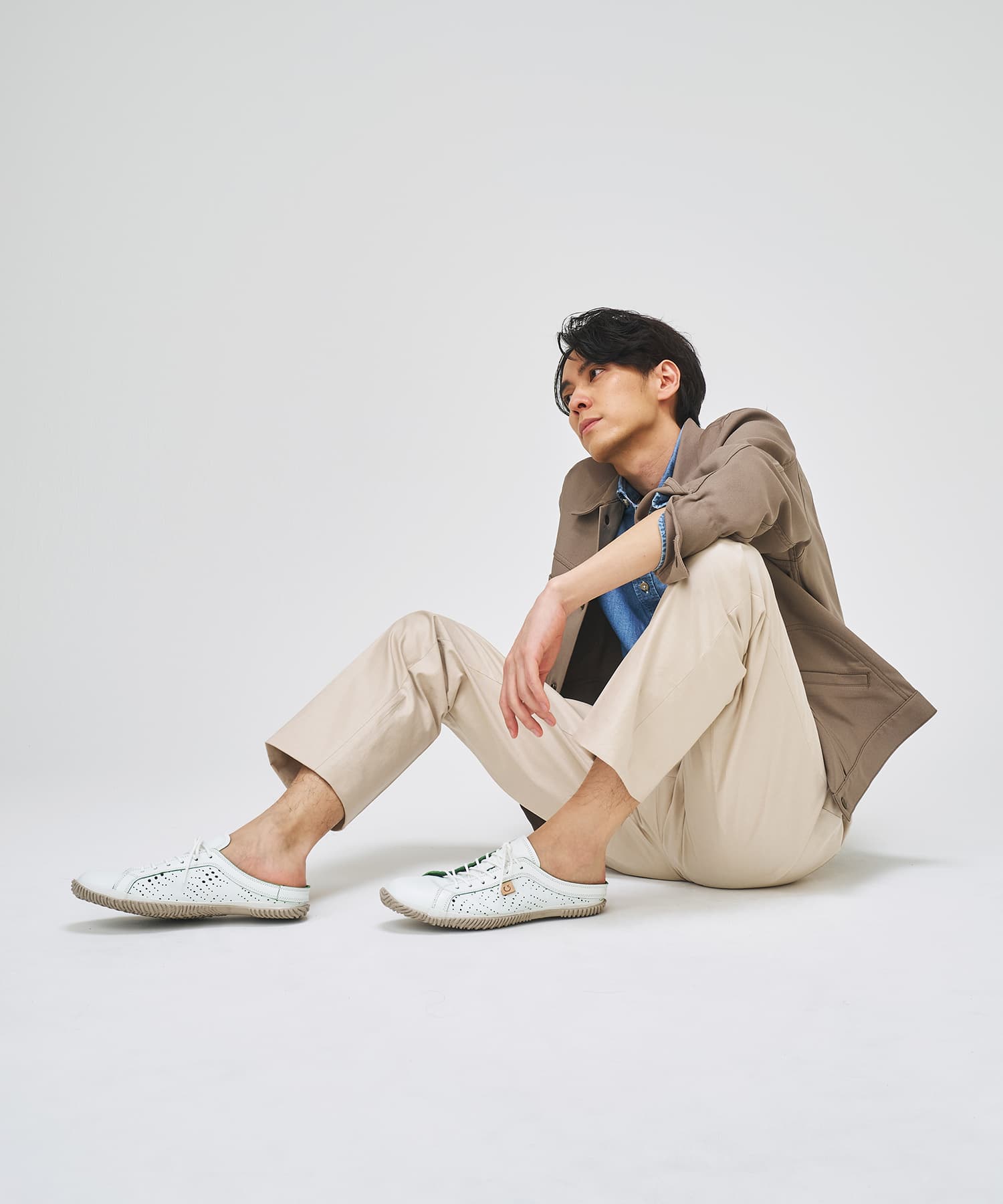 パンチング加工したクロッグスニーカーモデル。マイクロファイバー素材を表面に用いたインソールは足当たりが優しく、色の組み合わせやパンチング加工で遊び心溢れる一足です。