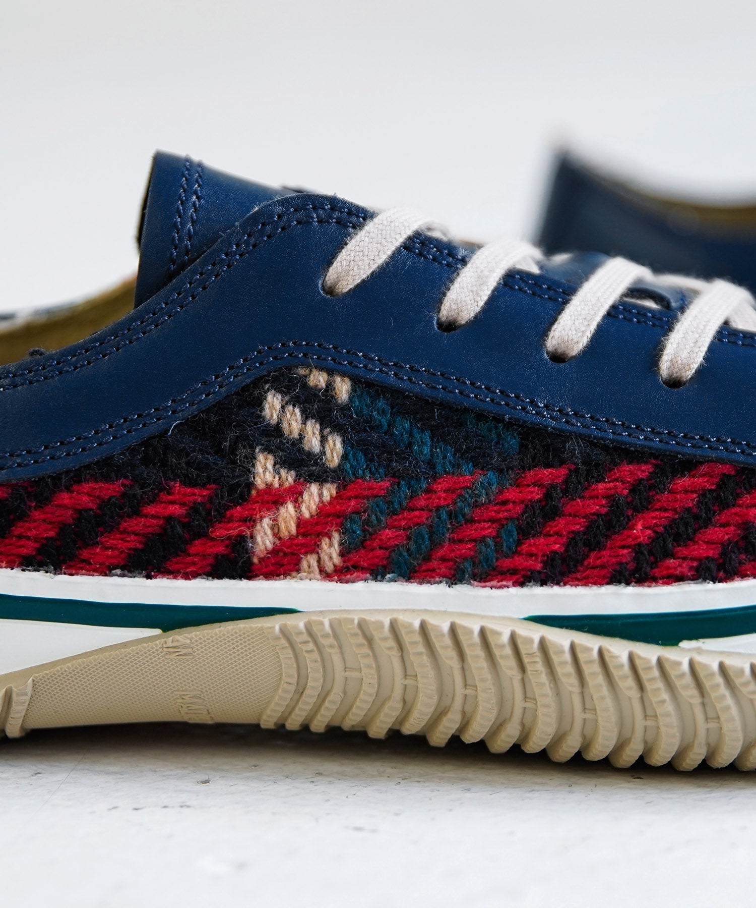 世界でも有数の毛織物産地として知られる愛知県の尾州織ウールをサイドに使用したローカット。フォクシングテープのラインやシューレースがデザインのアクセントになっています。ソールには当社ソールブランド「RUBEAR」のCNFソールを採用。植物由来の繊維素材セルロースナノファイバーをアウトソールのゴムに配合し、従来よりも耐摩耗性が約40%向上しています。グレーの替え紐付き。