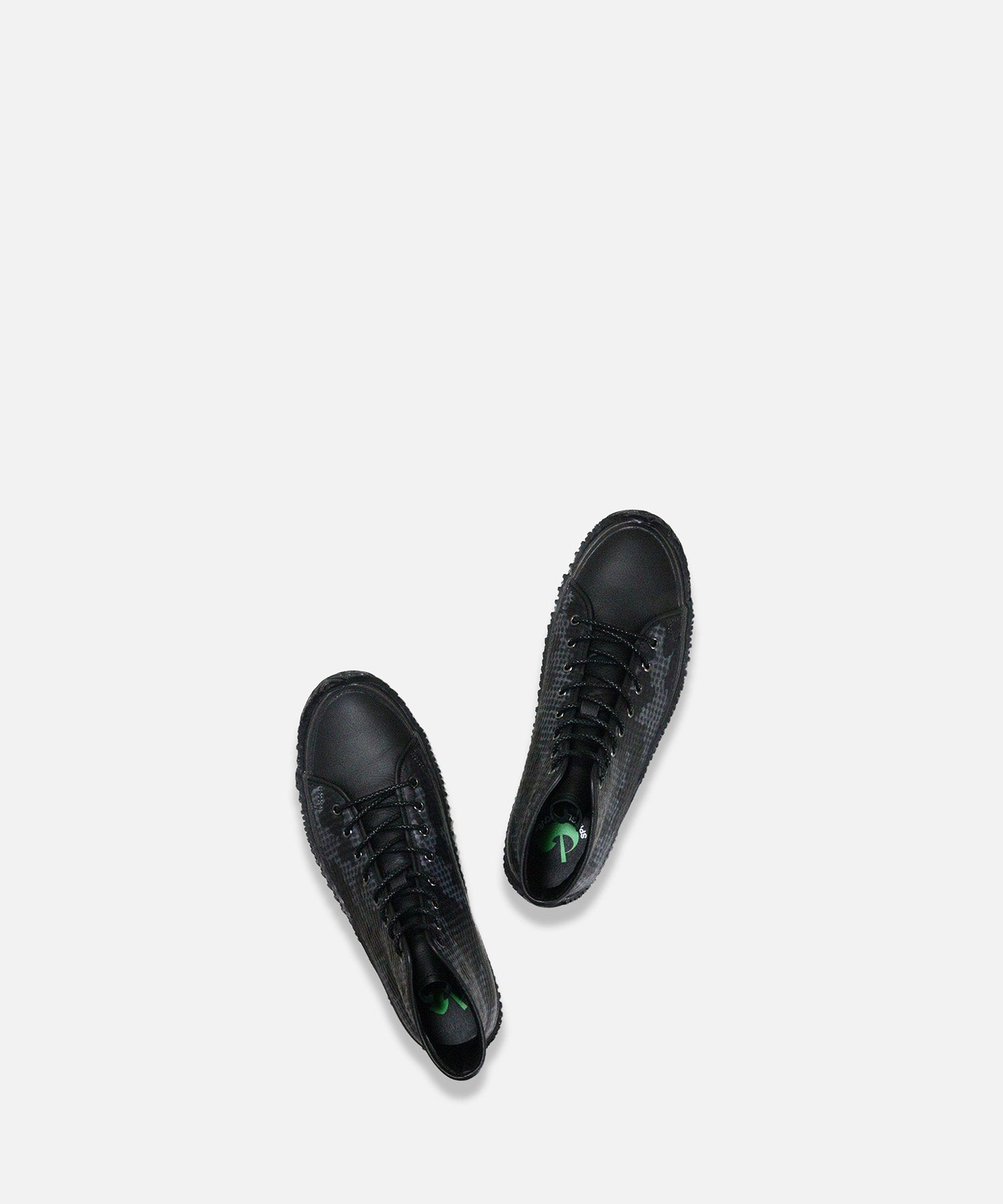 京都友禅の技法である手捺染(てなっせん)で染め上げた迷彩柄ハイカットモデル。1色ずつ染型を使って職人が手作業で染料を刷り込み、さらに化学反応を利用した塩縮加工で凹凸を表現しました。京都友禅は多彩な絵画調の模様を着物などに染め表す、日本を代表する染色技法。その伝統的な技術をレザーの染色に用い、スニーカーに仕立てました。