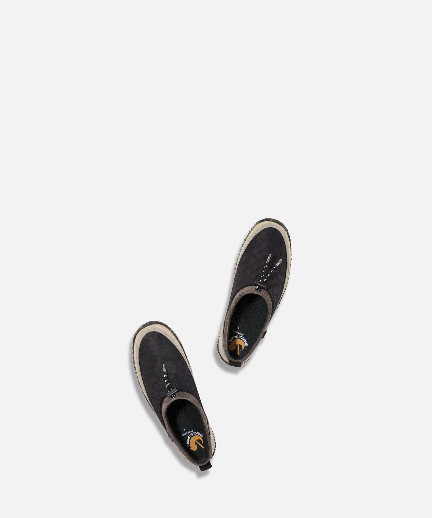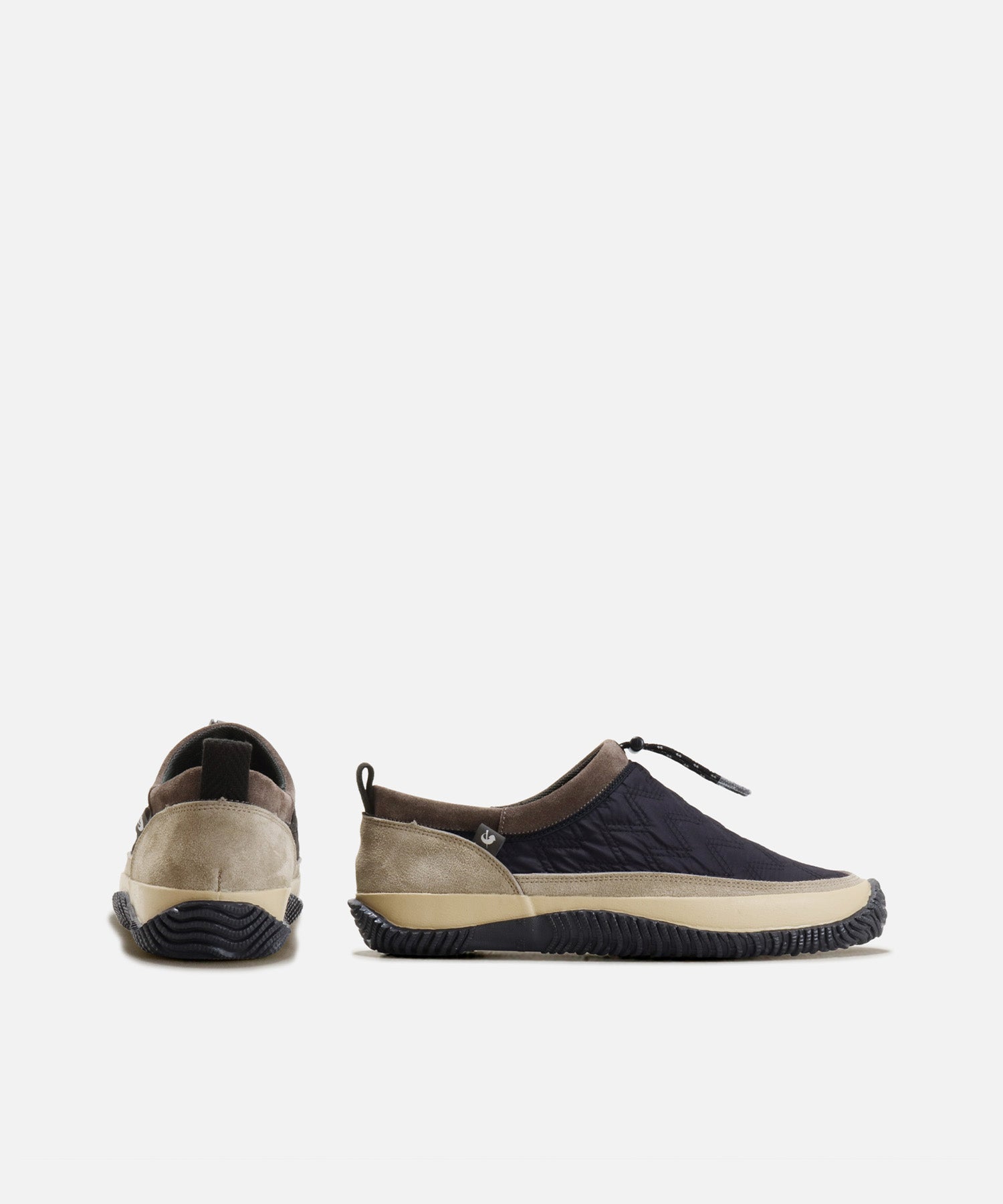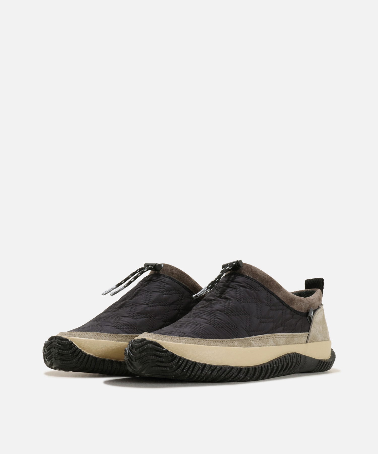 素材、中綿の量、ステッチデザインにこだわり特注したスピングルオリジナル撥水ナイロンのスリッポン。中綿とライニングには環境に配慮したリサイクル素材を使用。また当社ソールブランド「RUBEAR」のCNFソールの採用で、従来よりも耐摩耗性が約40%向上しています。かかとを踏んでも履ける仕様やリフレクターネームで、アウトドテイストに仕上げました。