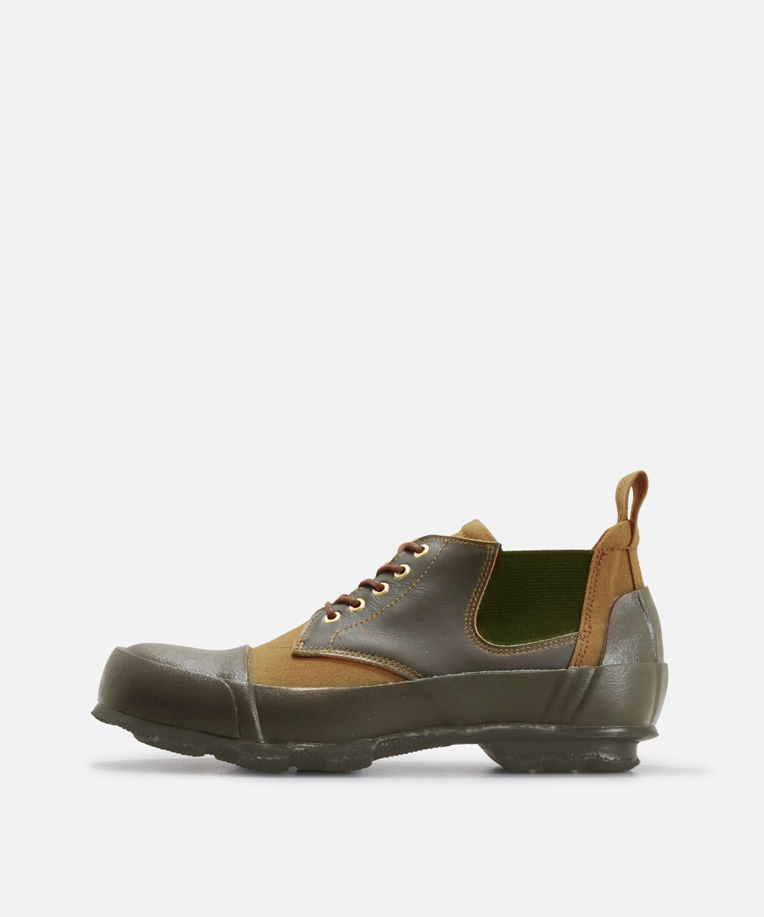 コンバットブーツの要素を取り入れたミリタリーテイストなレースアップシューズ。アッパーは撥水加工を施した牛革とキャンバス生地のコンビ。サイドゴアが伸縮し、着脱しやすくなっています。
