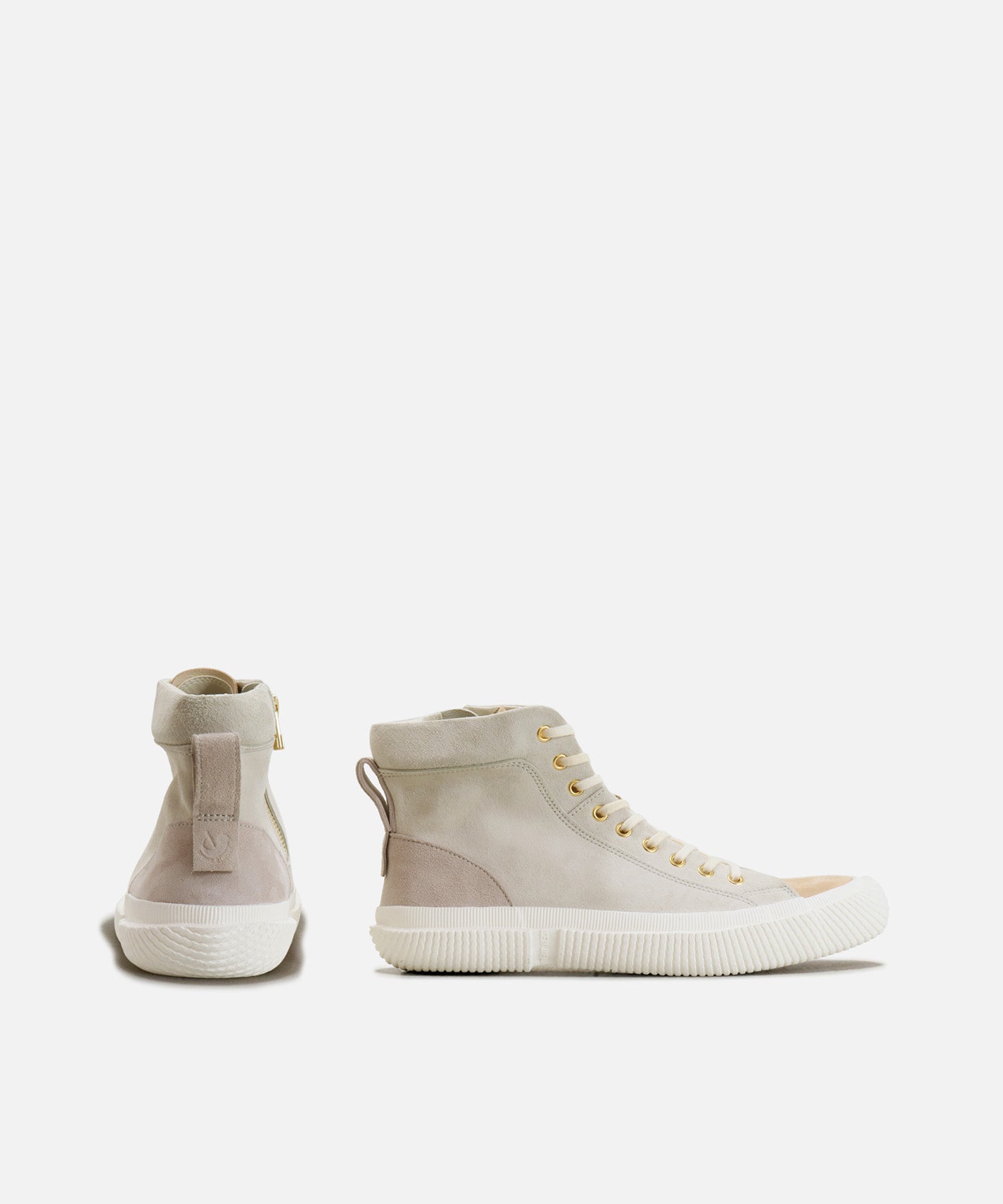 柔らかいタッチのゴート(山羊)スエードを使用し、ベージュを基調にした女性らしい配色のハイカット。ゴールドのハトメとファスナーでラグジュアリーさを演出しています。