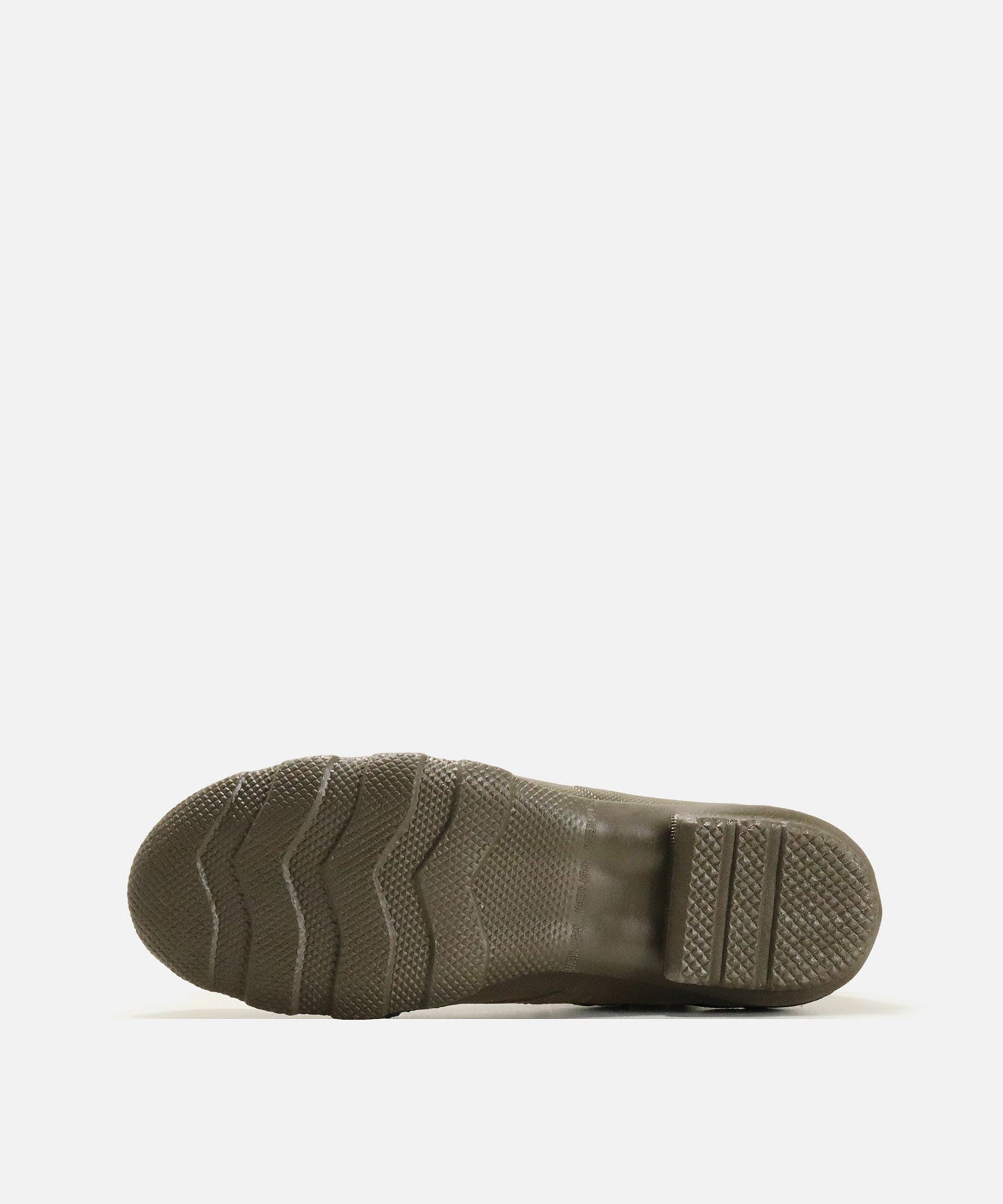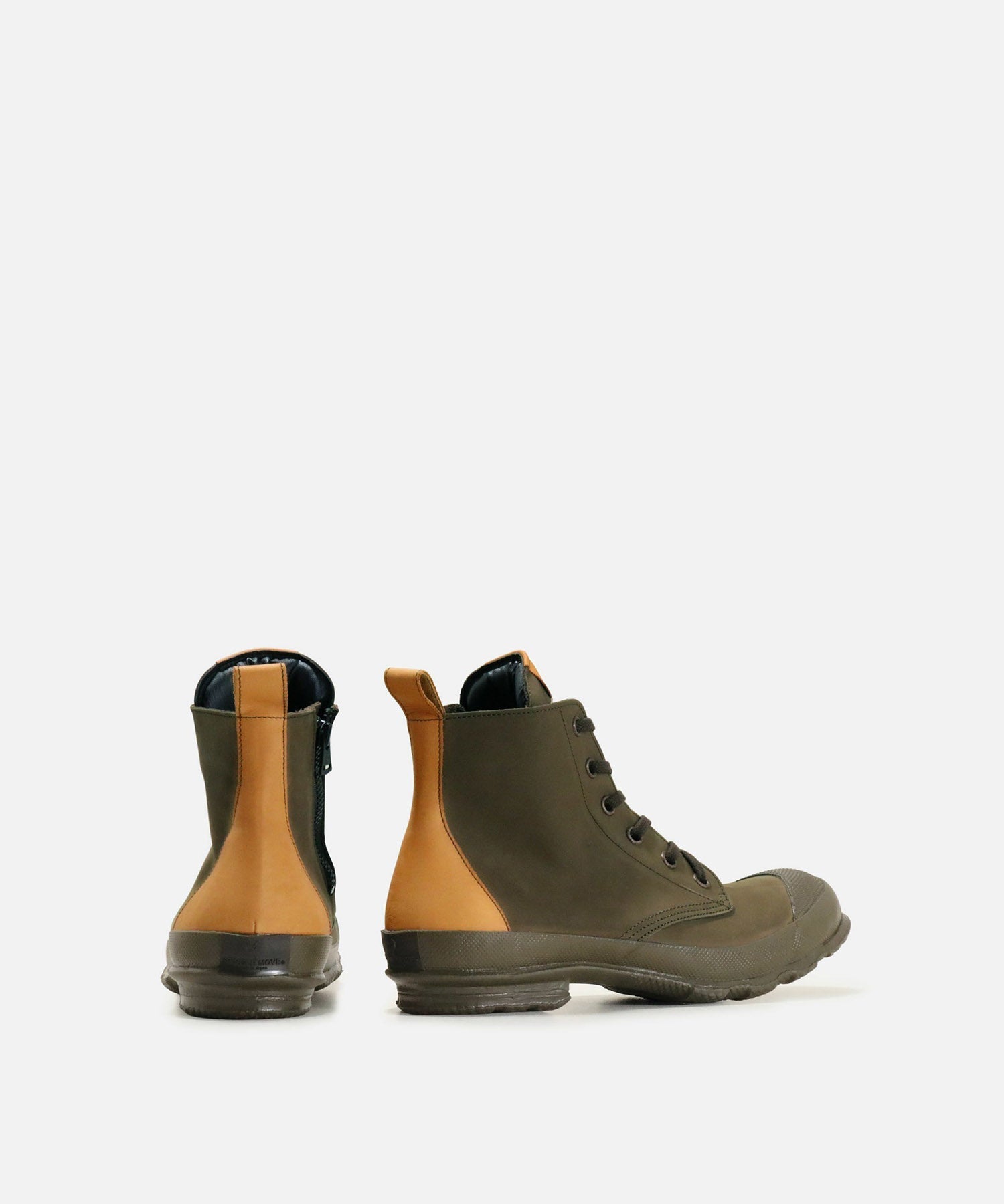 ヌバック素材のアッパーをタンレザーで切り返したクラシックコンバットブーツ。ベロにはクッション性のある厚めのスポンジが入り、ロゴを型押ししてアクセントに。アンティーク調のファスナーやサビ加工を施したハトメ、全体の配色やデザイン、トゥキャップなど、各パーツにこだわりを持ってクラシカルな佇まいを表現しています。