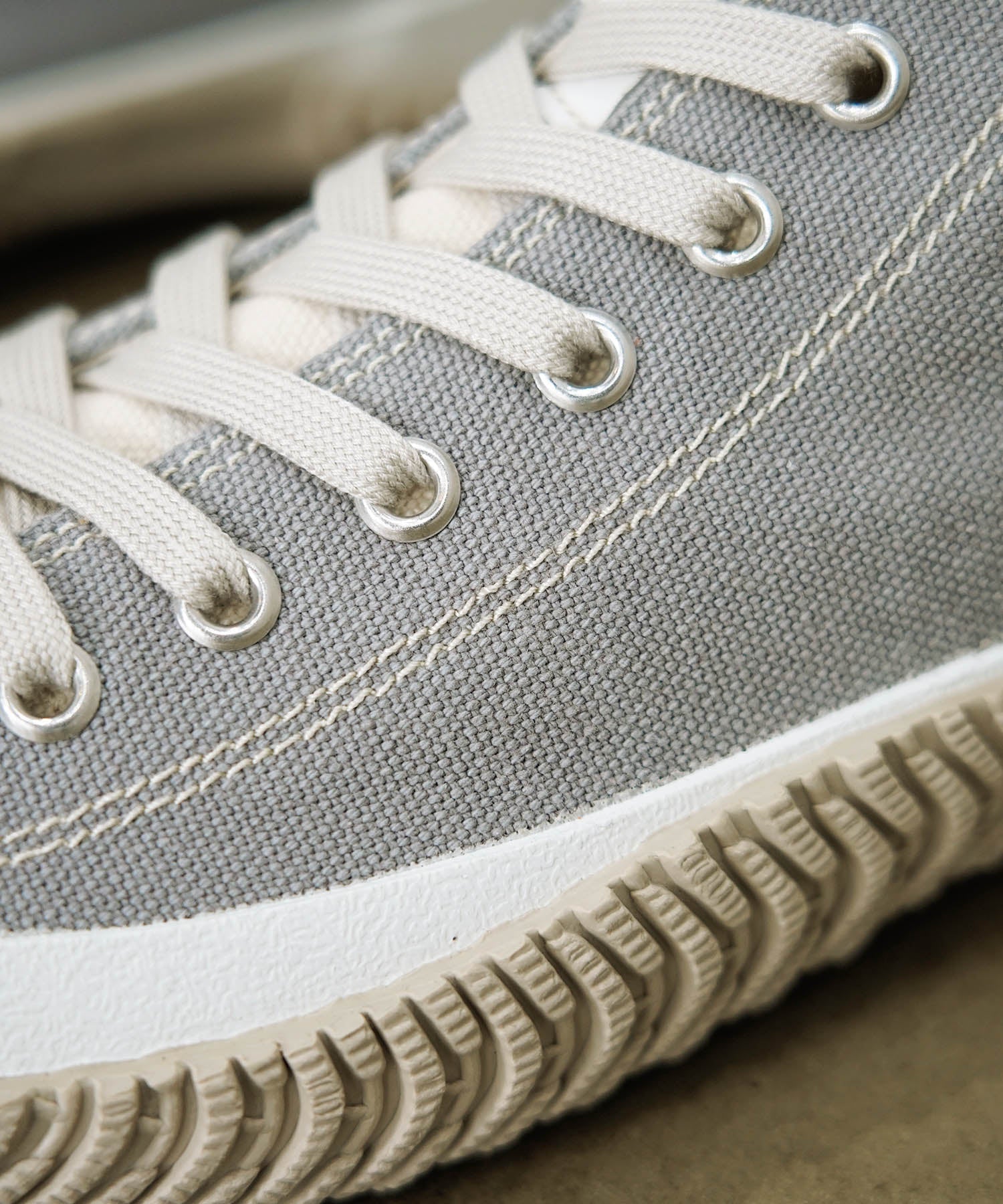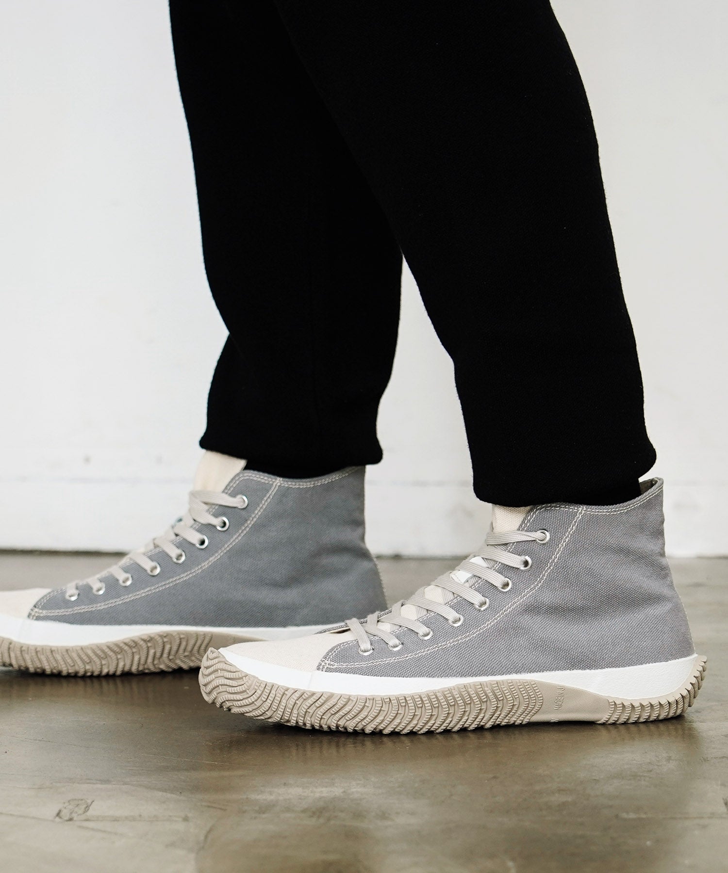 バイオウォッシュ加工キャンバスを使用したコンビカラーのハイカット。バイオウォッシュは酵素を使った洗い加工で、繊維が柔らかくなるのが特徴。8号帆布のキャンバスを柔らかく仕上げています。