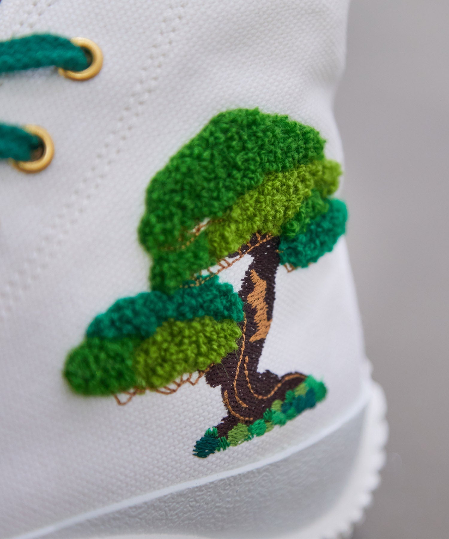 古くから縁起物として愛される『梅』と『松』を立体刺繍したハイカット。梅は冬の寒さの中で美しい花を咲かせることから堪え忍び飛躍するとう意味を持ち、福を迎えその年の縁起を担ぎます。松は冬でも緑で色が変わらないことから、心変わりしないという意や健康と長寿の象徴とされ、古くから縁起の良い木とされています。刺繍は、京都・亀岡を拠点にしている刺繍工房ドゥオモ社の技術を駆使して、立体的な仕上がりになっています。ドゥオモ社は30年以上に渡り培った伝統的な刺繍技術とモダンな刺繍技術を融合させており、スピングルと同じく日本の自社工場でこれまでに培った技術を活かし、溢れる想像、夢、探求心をカタチにしています。『京都から日本の工芸品を世界中へ』そんなビジョンを掲げる刺繍工房です。