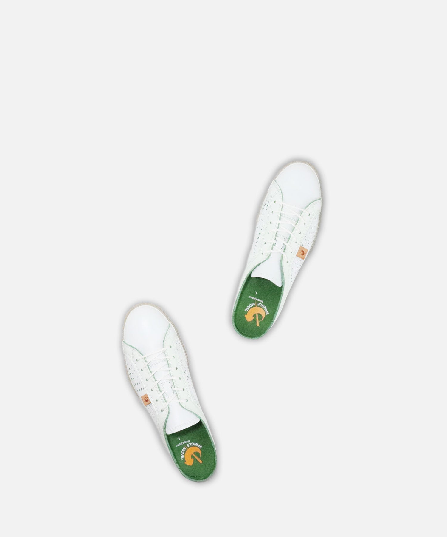 パンチング加工したクロッグスニーカーモデル。マイクロファイバー素材を表面に用いたインソールは足当たりが優しく、色の組み合わせやパンチング加工で遊び心溢れる一足です。